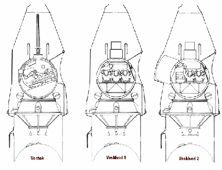 Wikipedia, The Voskhod programme (Russian: Восход, "ascent", "dawn") was a Soviet human spaceflight project. Voskhod development was both a follow-on to the Vostok programme, recycling components left over from that programme's cancellation following its first six flights. The two missions flown used the Voskhod spacecraft and rocket. DesignThe Voskhod flights were, in retrospect, merely aimed at making Soviet "firsts" in space exploration. While these missions were the goal of the Politburo's influence on the efforts of the Soviet space programme, they were achieved by significantly decreasing safety and reliability. The Voskhod spacecraft was basically a Vostok spacecraft that had a backup, solid fuel retrorocket added to the top of the descent module. The heavier weight of the craft was made possible by improvements to the R-7 Semyorka-derived booster. The ejection seat was removed and two or three crew couches were added to the interior at a 90-degree angle to that of the Vostok crew position. However, the position of the in-flight controls was not changed, so the crew had to crane their heads 90 degrees to see the instruments. In the case of Voskhod 2, an inflatable exterior airlock was also added to the descent module opposite the entry hatch. After use, the airlock was jettisoned. There was no provision for crew escape in the event of a launch or landing emergency. A solid fuel braking rocket was also added to the parachute lines to provide for a softer landing at touchdown. This was necessary because, unlike the Vostok, the Voskhod descent module landed with the crew still inside. FlightsThe Voskhod flights, with their dates of launch, were: Unmanned