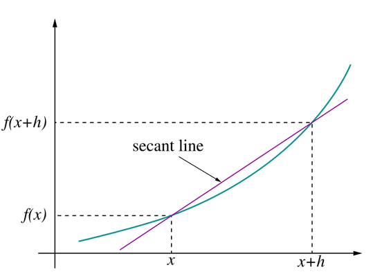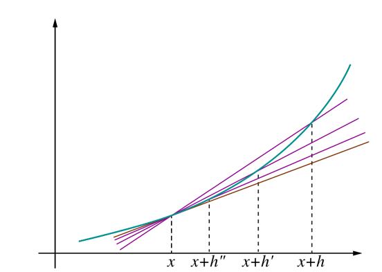 The idea, illustrated by Figures 1-3, is to compute the rate of change as the limiting value of the ratio of the differences Δy / Δx as Δx becomes infinitely small. In Leibniz's notation, such an infinitesimal change in x is denoted by dx, and the derivative of y with respect to x is written suggesting the ratio of two infinitesimal quantities. (The above expression is read as "the derivative of y with respect to x", "d y by d x", or "d y over d x". The oral form "d y d x" is often used conversationally, although it may lead to confusion.) The most common approach to turn this intuitive idea into a precise definition uses limits, but there are other methods, such as non-standard analysis. Definition via difference quotientsLet ƒ be a real valued function. In classical geometry, the tangent line at a real number a was the unique line through the point (a, ƒ(a)) which did not meet the graph of ƒ transversally, meaning that the line did not pass straight through the graph. The derivative of y with respect to x at a is, geometrically, the slope of the tangent line to the graph of ƒ at a. The slope of the tangent line is very close to the slope of the line through (a, ƒ(a)) and a nearby point on the graph, for example (a + h, ƒ(a + h)). These lines are called secant lines. A value of h close to zero will give a good approximation to the slope of the tangent line, and smaller values (in absolute value) of h will, in general, give better approximations. The slope m of the secant line is the difference between the y values of these points divided by the difference between the x values, that is, This expression is Newton's difference quotient. The derivative is the value of the difference quotient as the secant lines approach the tangent line. Formally, the derivative of the function ƒ at a is the limit of the difference quotient as h approaches zero, if this limit exists. If the limit exists, then ƒ is differentiable at a. Here f′ (a) is one of several common notations for the derivative (see below). Equivalently, the derivative satisfies the property that which has the intuitive interpretation (see Figure 1) that the tangent line to ƒ at a gives the best linear approximation to ƒ near a (i.e., for small h). This interpretation is the easiest to generalize to other settings (see below). Substituting 0 for h in the difference quotient causes division by zero, so the slope of the tangent line cannot be found directly. Instead, define Q(h) to be the difference quotient as a function of h:
