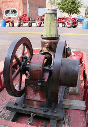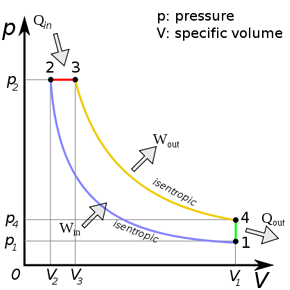 The internal combustion engine is an engine in which the combustion of a fuel occurs with an oxidiser (usually air) in a combustion chamber. In an internal combustion engine the expansion of the high temperature and pressure gases, that are produced by the combustion, directly apply force to a movable component of the engine, such as the pistons or turbine blades and by moving it over a distance, generate useful mechanical energy. The term internal combustion engine usually refers to an engine in which combustion is intermittent, such as the more familiar four-stroke and two-stroke piston engines, along with variants, such as the Wankel rotary engine. A second class of internal combustion engines use continuous combustion: gas turbines, jet engines and most rocket engines, each of which are internal combustion engines on the same principle as previously described. The internal combustion engine (or ICE) is quite different from external combustion engines, such as steam or Stirling engines, in which the energy is delivered to a working fluid not consisting of, mixed with or contaminated by combustion products. Working fluids can be air, hot water, pressurised water or even liquid sodium, heated in some kind of boiler by fossil fuel, wood-burning, nuclear, solar etc. A large number of different designs for ICEs have been developed and built, with a variety of different strengths and weaknesses. While there have been and still are many stationary applications, the real strength of internal combustion engines is in mobile applications and they completely dominate as a power supply for cars, aircraft, and boats, from the smallest to the biggest. Only for hand-held power tools do they share part of the market with battery powered devices. Powered by an energy-dense fuel (nearly always liquid, derived from fossil fuels) the ICE delivers an excellent power-to-weight ratio with few safety or other disadvantages. ApplicationsInternal combustion engines are most commonly used for mobile propulsion in vehicles and portable machinery. In mobile equipment, internal combustion is advantageous since it can provide high power-to-weight ratios together with excellent fuel energy density. Generally using fossil fuel (mainly petroleum), these engines have appeared in transport in almost all vehicles (automobiles, trucks, motorcycles, boats, and in a wide variety of aircraft and locomotives). Internal combustion engines appear in the form of gas turbines as well where a very high power is required, such as in jet aircraft, helicopters, and large ships. They are also frequently used for electric generators and by industry. ClassificationAt one time the word, "Engine" (from Latin, via Old French, ingenium, "ability") meant any piece of machinery—a sense that persists in expressions such as siege engine. A "motor" (from Latin motor, "mover") is any machine that produces mechanical power. Traditionally, electric motors are not referred to as, "Engines"; however, combustion engines are often referred to as, "motors." (An electric engine refers to a locomotive operated by electricity.) Engines can be classified in many different ways: By the engine cycle used, the layout of the engine, source of energy, the use of the engine, or by the cooling system employed. Principles of operationContinuous combustion: Brayton cycle: