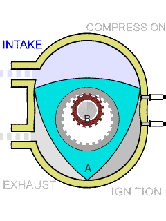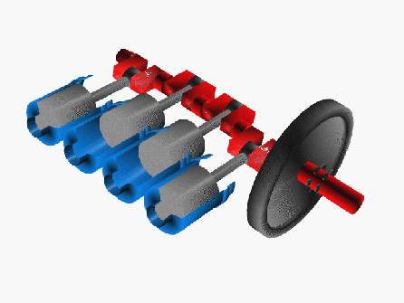 For a four-stroke engine, key parts of the engine include the crankshaft (purple), connecting rod (orange), one or more camshafts (red and blue), and valves. For a two-stroke engine, there may simply be an exhaust outlet and fuel inlet instead of a valve system. In both types of engines there are one or more cylinders (grey and green), and for each cylinder there is a spark plug (darker-grey, gasoline engines only), a piston (yellow), and a crankpin (purple). A single sweep of the cylinder by the piston in an upward or downward motion is known as a stroke. The downward stroke that occurs directly after the air-fuel mix passes from the carburetor or fuel injector to the cylinder, where it is ignited. This is also known as a power stroke. A Wankel engine has a triangular rotor that orbits in an epitrochoidal (figure 8 shape) chamber around an eccentric shaft. The four phases of operation (intake, compression, power, and exhaust) take place in what is effectively a moving, variable-volume chamber. ValvesAll four-stroke internal combustion engines employ valves to control the admittance of fuel and air into the combustion chamber. Two-stroke engines use ports in the cylinder bore, covered and uncovered by the piston, though there have been variations such as exhaust valves. Piston engine valvesIn piston engines, the valves are grouped into 'inlet valves' which admit the entrance of fuel and air and 'outlet valves' which allow the exhaust gases to escape. Each valve opens once per cycle and the ones that are subject to extreme accelerations are held closed by springs that are typically opened by rods running on a camshaft rotating with the engines' crankshaft. Control valvesContinuous combustion engines—as well as piston engines—usually have valves that open and close to admit the fuel and/or air at the startup and shutdown. Some valves feather to adjust the flow to control power or engine speed as well. Exhaust systemsInternal combustion engines have to manage the exhaust of the cooled combustion gas from the engine. The exhaust system frequently contains devices to control pollution, both chemical and noise pollution. In addition, for cyclic combustion engines the exhaust system is frequently tuned to improve emptying of the combustion chamber. For jet propulsion internal combustion engines, the 'exhaust system' takes the form of a high velocity nozzle, which generates thrust for the engine and forms a colimated jet of gas that gives the engine its name. Cooling systemsCombustion generates a great deal of heat, and some of this transfers to the walls of the engine. Failure will occur if the body of the engine is allowed to reach too high a temperature; either the engine will physically fail, or any lubricants used will degrade to the point that they no longer protect the engine. Cooling systems usually employ air (air cooled) or liquid (usually water) cooling while some very hot engines using radiative cooling (especially some Rocket engines). Some high altitude rocket engines use ablative cooling where the walls gradually erode in a controlled fashion. Rockets in particular can use regenerative cooling which uses the fuel to cool the solid parts of the engine. PistonA piston is a component of reciprocating engines. It is located in a cylinder and is made gas-tight by piston rings. Its purpose is to transfer force from expanding gas in the cylinder to the crankshaft via a piston rod and/or connecting rod. In two-stroke engines the piston also acts as a valve by covering and uncovering ports in the cylinder wall. Propelling nozzleFor jet engine forms of internal combustion engines a propelling nozzle is present. This takes the high temperature, high pressure exhaust and expands and cools it. The exhaust leaves the nozzle going at much higher speed and provides thrust, as well as constricting the flow from the engine and raising the pressure in the rest of the engine, giving greater thrust for the exhaust mass that exits. CrankshaftMost reciprocating internal combustion engines end up turning a shaft. This means that the linear motion of a piston must be converted into rotation. This is typically achieved by a crankshaft. FlywheelsThe flywheel is a disk or wheel attached to the crank, forming an inertial mass that stores rotational energy. In engines with only a single cylinder the flywheel is essential to carry energy over from the power stroke into a subsequent compression stroke. Flywheels are present in most reciprocating engines to smooth out the power delivery over each rotation of the crank and in most automotive engines also mount a gear ring for a starter. The rotational inertia of the flywheel also allows a much slower minimum unloaded speed and also improves the smoothness at idle. The flywheel may also perform a part of the balancing of the system and so by itself be out of balance, although most engines will use a neutral balance for the flywheel, enabling it to be balanced in a separate operation. The flywheel is also used as a mounting for the clutch or a torque converter in most automotive applications. Starter systemsAll internal combustion engines require some form of system to get them into operation. Most piston engines use a starter motor powered by the same battery as runs the rest of the electric systems. Large jet engines and gas turbines are started with a compressed air motor that is geared to one of the engine's driveshafts. Compressed air can be supplied from another engine, a unit on the ground or by the aircraft's APU. Small internal combustion engines are often started by pull cords. Motorcycles of all sizes were traditionally kick-started, though all but the smallest are now electric-start. Large stationary and marine engines may be started by the timed injection of compressed air into the cylinders - or occasionally with cartridges. Jump starting refers to assistance from another battery (typically when the fitted battery is discharged), while bump startin