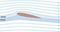 Wikipedia, A fluid flowing past the surface of a body exerts a force on it. Lift is defined to be the component of this force which is perpendicular to the oncoming flow direction. It contrasts with the drag force, which is defined to be the component of the fluid-dynamic force parallel to the flow direction. If the fluid is air, the force is called an aerodynamic force. An airfoil is a streamlined shape that is capable of generating significantly more lift than drag. Aerodynamic lift is commonly associated with the wing of a fixed-wing aircraft, although lift is also generated by propellers; helicopter rotors; rudders, sails and keels on sailboats; hydrofoils; wings on auto racing cars; wind turbines and other streamlined objects. While common meanings of the word "lift" suggest that lift opposes gravity, lift can be in any direction. When an aircraft is flying straight and level (cruise) most of the lift opposes gravity. However, when an aircraft is climbing, descending, or banking in a turn, for example, the lift is tilted with respect to the vertical and the lift is greater than, or less than, the weight of the aircraft. Lift may also be entirely downwards in some aerobatic manoeuvres, or on the wing on a racing car. In this last case, the term downforce is often used. Non-streamlined objects such as bluff bodies and plates (not parallel to the flow) may also generate lift when moving relative to the fluid. This lift may be steady, or it may oscillate due to vortex shedding. Interaction of the object's flexibility with the vortex shedding may enhance the effects of fluctuating lift and cause vortex-induced vibrations. Description of lift on an airfoilLift is generated in accordance with the fundamental principles of physics. The most relevant physics reduce to three principles: