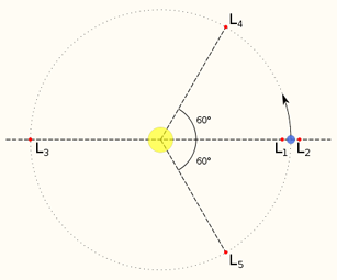 L5L5 is the Lagrangian point located close to the Earth's orbit 60° behind the Earth.