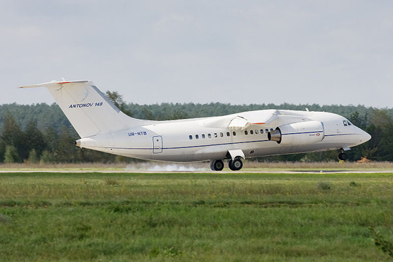 The Antonov An-148 (Ukrainian: Антонов Ан-148) is a regional jet aircraft designed by the Ukrainian aircraft firm Antonov. In December 2006 the An-148 completed certification testing and on February 26, 2007 received its type certificate with the Motor Sich D-436-148 enginesand AI-450-MS Auxiliary Power Unit, a variant of the -9 APU series , from the Interstate Aviation Committee Aviation Register (IAC AR). There are plans to certify this airplane according to Joint Aviation Authorities JAR-25 standards, as the existing certification have already been designed to meet the ICAO Ch. 4 (noise and environmental requirements) as well as the established Western European airworthiness rules . An-148 is currently produced by Kyiv Aircraft Plant AVIANT, Ukraine, and Voronezh Aircraft Production Association, Russia. Ukrainian Aerosvit Airlines started using An-148 at regular flights on 2 June 2009. DesignThe An-148 aircraft is a high-wing monoplane with twin jet turbine engines mounted in pods under the wing. This arrangement protects the engines and wing structure against damage from foreign objects (FOD). A built-in auto-diagnosis system, auxiliary power unit, high reliability, as well as the wing configurating allow the An-148 to be used at poorly equipped airfields. Modern flight and navigation equipment, multifunctional displays and a fly-by-wire system enable the An-148 aircraft to operate day and night, under IFR and VFR weather conditions on high density air routes. The An-148 cockpit features five 15 cm by 20 cm (6" by 8") LCDs built by Russia’s Aviapribor and fly-by-wire flight controls (using technologies developed for the An-70 cargo transport) Variants