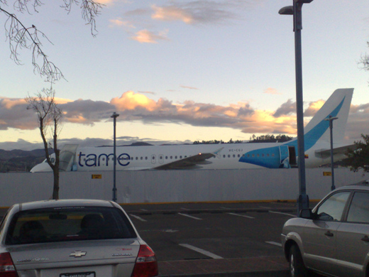 A TAME Airbus A320 with the new colors parked in the Mariscal Lamar Airport in Cuenca, Ecuador |