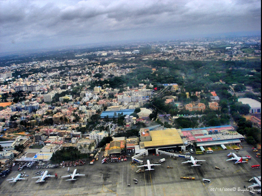 HAL Bangalore International Airport (ICAO: VOBG), also known as HAL Airport or Hindustan Airport, is the airport of the Hindustan Aeronautics Limited (HAL) facility at Bangalore, Karnataka, India. The airport is used to test and develop aircraft for the Indian Armed Forces. Manufacturing and overhauling of such aircraft has averaged nearly one per day (on a company-wide, All-India basis) over the 40 year life span of the firm. It was also a domestic and international airport serving the city. However this usage is now defunct, as its passenger usage was replaced by the new Bengaluru International Airport on 24 May 2008. It handled an estimated 7.5 million passengers a year as of 2006 and an average of at least 550 flights (takeoffs and landings) per day, earning an estimated Rs 1-1.5 billion in landing and aircraft parking fees from scheduled airlines. OverviewOriginally set up by HAL in 1964, mainly for defence purposes, operations were extended for domestic commercial flights in the 1980s while the airport started to serve international destinations in 1997. In the past decade, the airport has gone through a series of expansions and upgrades to keep pace with the growing civilian air traffic in the city. While the rated capacity of the airport was 3.6 million passengers per year it was last operating at a super saturated level of 7.5 million. Reportedly HAL requested airlines to discontinue the addition of flights to and from Bangalore some time ago. In the mid 1990s, friction started to arise between the Airports Authority of India (AAI) and HAL. AAI wanted more control over airport management which HAL refused, citing national security concerns. The HAL airport is the site of much of HAL's test and research facility. Currently, more than 50% of the Indian Air Force fleet consists of aircraft manufactured by HAL. The airport's management issue also caused contention between the Ministry of Defence and the Ministry of Civil Aviation. Thus turf wars may have been the major problem, and not over-riding operational factors. In 2005, a private consortium, Bangalore International Airport Limited, (BIAL), in which AAI was a minority shareholder, finally started construction on the new Bengaluru International Airport. Now completed and commissioned, BIAL has replaced HAL airport as Bangalore's international and domestic airport, while HAL airport will serve only as a test and research facility for HAL. The new airport is about 35 km (22 mi) from Bangalore and a new 6-lane highway has being built to access it. Travel time can be up to 3 hours from the southern parts of the city. Hence low cost airlines are making strong representations to the Civil Aviation Minister to let them continue to use the more conveniently located HAL airport despite the contractual obligation to close down the airport's civil enclave. Land side structureThere are separate check-in sections for domestic and international departures, and separate sections for domestic and international arrivals. The airport has two aerobridges and preference on using the aerobridges is given to international flights. HAL Airport is relatively close to the city centre (12 km (7.5 mi)). A taxi ride from the airport to the city centre, in peak hour traffic takes between 1/2 - 1 hour. Air side structureHAL Airport has one runway, oriented to 90/270 degrees. There are 4 entry/exit taxiways, 2 on the east side called E2 (perimeter) and E1. Similarly there are 2 taxiways to the west side - W2 (perimeter) and W1. There are now 5 aprons, apron 1 through apron 5. Apron 1 is the main apron, and has 10 parking bays. Bay 5 and bay 6 correspond to the 2 aerobridges. Apron 5 was opened in 2006 and has 5 bays. ATC frequencies in useThe frequencies normally in use at VOBG are: