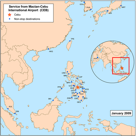 Mactan-Cebu International Airport (Filipino: Paliparang Pandaigdig ng Mactan-Cebu, Cebuano: Tugpahanang Pangkalibutanon sa Mactan-Sugbo) (IATA: CEB, ICAO: RPVM) is a major international airport in the Visayas region of the Philippines. It is located in Lapu-Lapu City, Mactan Island, Metro Cebu and is the country's second primary gateway. The airport is managed by the Mactan-Cebu International Airport Authority. The airport has a large apron, a single 3,300 meter runway, and a taxiway. The terminal building incorporates both domestic and international wings with a combined capacity for 4.5 million passengers. The airport covers an area of 797 hectares. Mactan-Cebu International Airport is a major trade center in the south for both domestic and international traffic. Its traffic is continually increasing and is now serving 602 commercial flights weekly transporting 10,223 passengers daily. Narrow-bodied aircraft such as A319, A320, A321, B737, and wide-bodied aircraft such A300, A330, A340, B777 and B747 have been introduced in international flights to Mactan and in the domestic trunk routes. Mactan-Cebu International Airport reported recently an average of 161 daily aircraft operations (landings and take-offs). About 54% of the flight operations at Mactan-Cebu International Airport are commercial carriers while the remaining 46% are military aircraft and general aviation operations. Over the last fifteen (15) years, Mactan-Cebu International Airport’s passenger traffic has grown at an annual average of 21% for International while the domestic grew at an annual average of 5%. Mactan-Cebu International Airport is currently served by fourteen (14) passenger airlines and three (3) cargo airlines. Mactan-Cebu International Airport is one of the major cargo airports in the Philippines. Air cargo volume in 2007 is 53,472,924 kg. International cargo volume increased at an average growth rate of 47% annually while the domestic cargo grew at an average of 4% per annum. There was a healthy growth rate of air transport movement for the year 2007, an increase of 31% for international and 8% for domestic compared the other year. A total of 3,731,500 domestic and international passengers passed through the airport back in 2007, marking an increase of 22% compared to the passenger throughput back in 2006. For the year 2007 cargo volume rose by 8% for domestic and an increase of 2% for international compared last year. Future plansPlans have been drawn for the expansion of the existing terminal building and the construction of two more boarding bridges or jetways to complement the existing four. A new cargo terminal has also been proposed. On August 20, 2008, the Mactan-Cebu International Airport Authority (MCIAA) announced that about P300 million will be spent for the terminal expansion program to address the increasing volume of passenger traffic. MCIAA general manager Danilo Augusto Francia said the program also includes the establishment of a second passenger terminal in the Mactan-Cebu International Airport. Later in 2009, MCIAA general manager Danilo Augusto Francia announced for the public bidding for the construction of the new generation terminal to service only international flight to and from Cebu, Philippines. Three out of the only 6 5-star airlines in the world operate flights from the airport, namely: Cathay Pacific, Qatar Airways, and Asiana Airlines. HistoryThe airport opened in the mid-1960s. It was built to replace the Lahug Airport, which could no longer be expanded due to safety and physical problems. The airport was then expanded in its later years to become the current Mactan-Cebu International Airport (MCIA). The airport is currently the second busiest in the country after Manila's Ninoy Aquino International Airport and serves as the country's primary alternative gateway. The airport is currently in the process of building an administrative building. The construction is currently stalled due to irregularities in the deal but it is expected to continue soon. The idea behind the building is to free up space in the airport terminal so that the airport can expand passenger facilities without necessarily expanding the size of the airport. Currently, all airport offices are located inside the Main Terminal. A VIP Lounge for the ASEAN Summit held in Cebu in 2007. The airport lounge now serves as the primary welcome area for VIPs visiting Cebu. Terminals, airlines and destinations