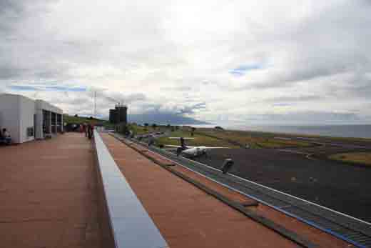 Scene atop the main terminal building, showing the runway, flight and mountain of Pico in the distance |
