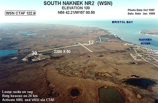 South Naknek Airport (IATA: WSN, ICAO: PFWS, FAA LID: WSN), also known as South Naknek Nr 2 Airport, is a state-owned public-use airport located one nautical mile (1.85 km) southwest of the central business district of South Naknek, in the Bristol Bay Borough of the U.S. state of Alaska.