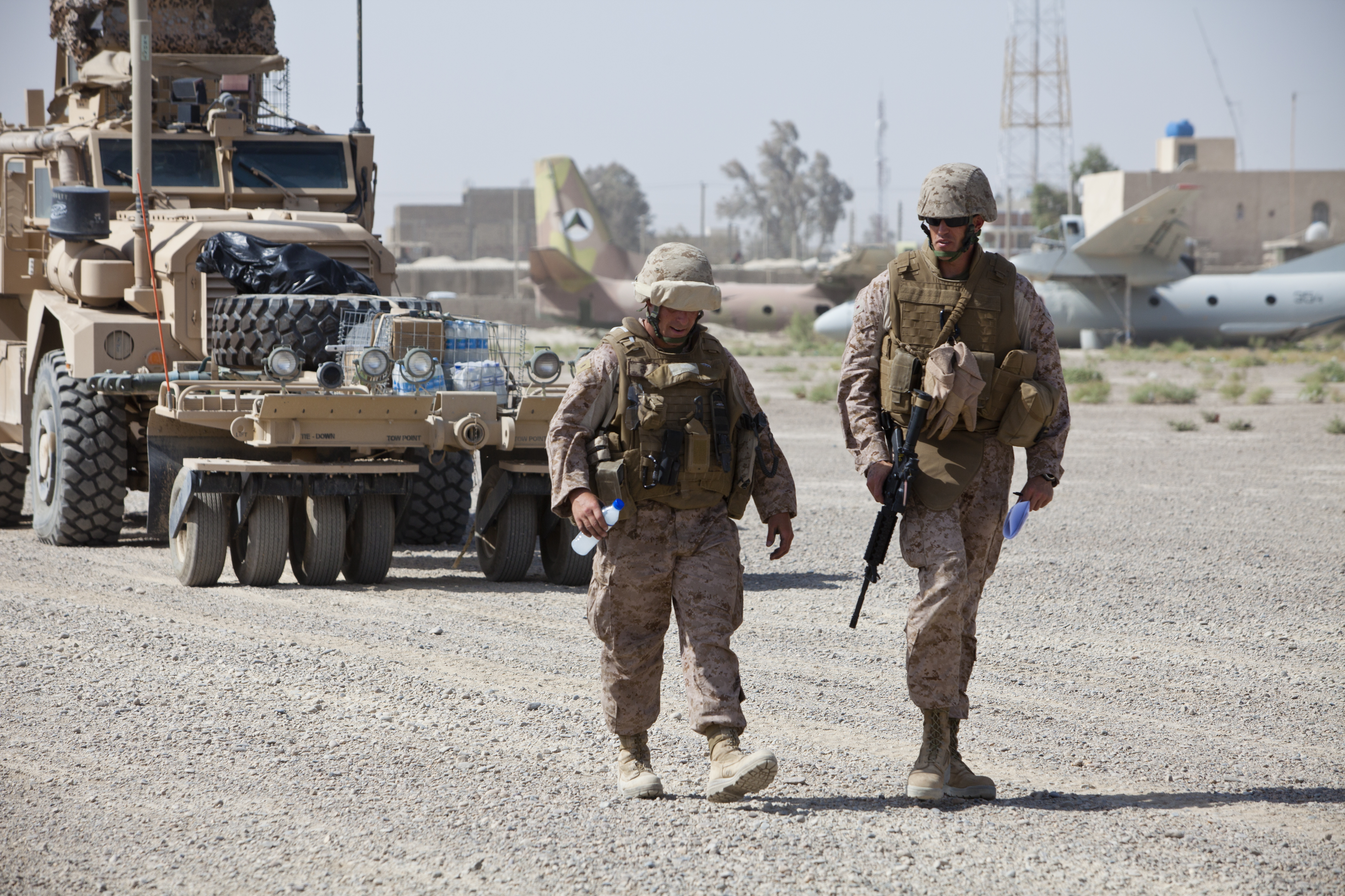 Members of the U.S. Marine Corps performing a safety inspection of the runway, July 2012