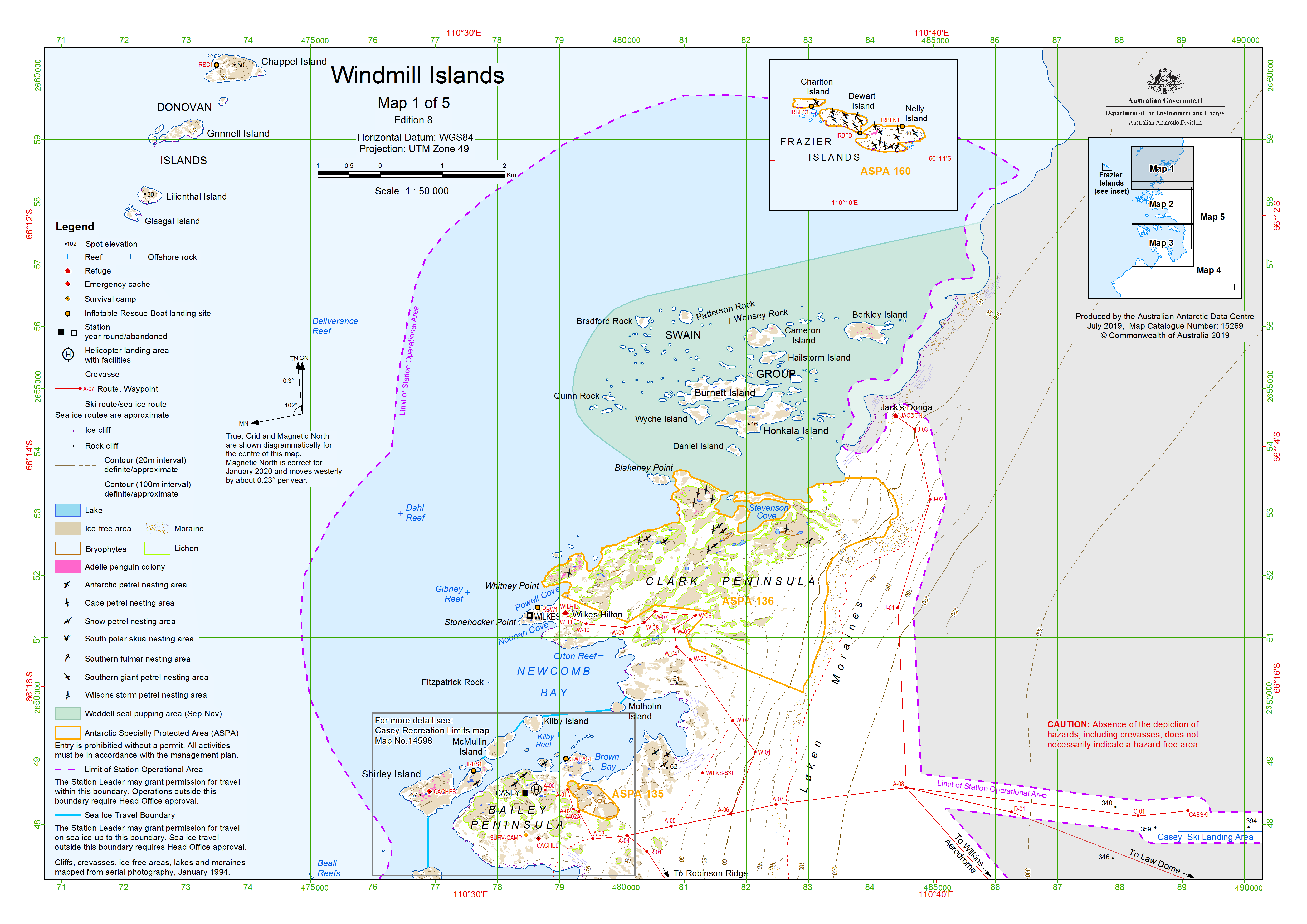 Location east of Casey Station proper. Image by Australian Antarctic Division (Australia), Map 15269: Windmill Islands. CC BY 3.0. Casey Station is significant as a transport hub for the Australian Antarctic program, with the introduction of intercontinental jet flights for scientists and operational staff from Hobart to the Wilkins ice runway, 65 kilometres (40 mi) inland from Casey station. The inaugural landing of the AAD's Airbus A319 aircraft was on the evening of 9 December 2007. In March 2009, the Australian ABC Foreign Correspondent international affairs television program featured air operations at Casey Station as part of a report titled Antarctica - What Lies Beneath.