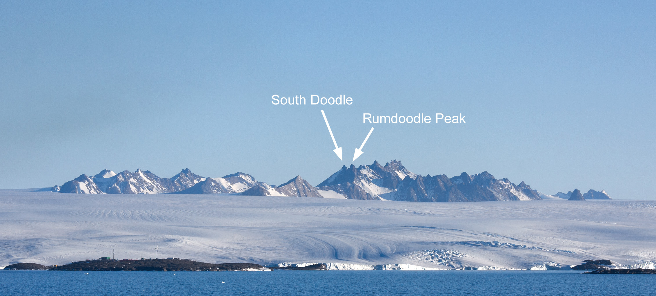 Rumdoodle Peak, elevation 875 m ASL, is a small but prominent mountain in the north-western part of the North Masson Range in Antarctica, near Mawson Station. It was named, around 1960, after the previously fictitious peak featured in the comic novel The Ascent of Rum Doodle by William Ernest Bowman. There is a small hut at the base (altitude 498m ASL), sleeping 5 people, and two permanently frozen lakes alongside, named Rumdoodle Lake and Lassitude Lake. In late summer when sea ice conditions are unfavourable and the ski landing area (SLA) adjacent to Mawson can no longer be used, air transport operations are moved to Rumdoodle SLA, a field camp on the inland ice plateau 10 km from Mawson. Rumdoodle SLA has been in use since the 1950s. The glacial surface is subject to wind scouring, melt, snow accumulation and ablation, and requires annual inspection and preparation prior to use. It is accessible from Mawson by Hägglunds ground vehicles.
