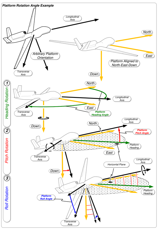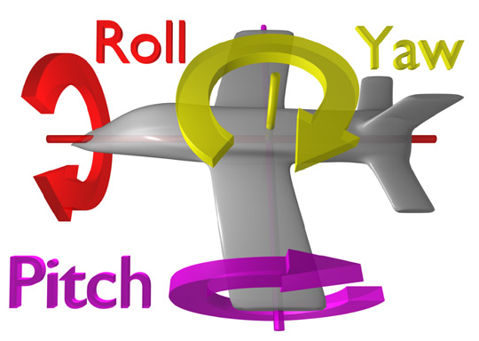 Yaw, Pitch and Roll in an aircraft Principal axesYaw/heading, pitch and roll angles and associated vertical (down), transverse and longitudinal axes