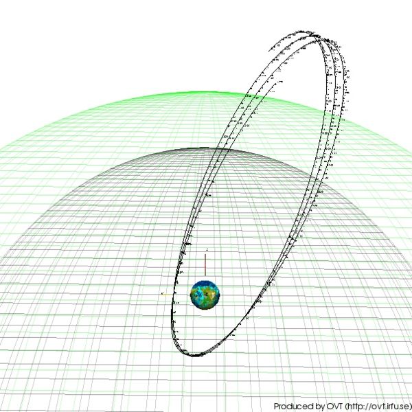 Cluster orbit during one week from March 21, 2004, viewed from the north ecliptic pole. The wire grids represent average positions of the bow shock (outer, green) and the magnetopause (inner, blue) of the Earth's magnetosphere. Because of Earth's motion around the Sun, the spacecraft orbit appears to turn in this figure, where the direction to the Sun is upward. |