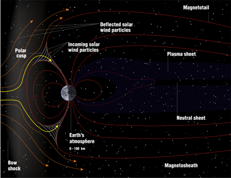 - In two regions, one in the northern hemisphere and the other in the south, the magnetic field of the Earth is perpendicular rather than tangential to the magnetopause. These polar cusps allow solar wind particles, consisting of ions and electrons, to flow into the magnetosphere. Cluster records the particle distributions, which allow the turbulent regions at the exterior cusps to be characterized.
