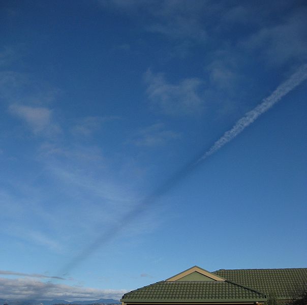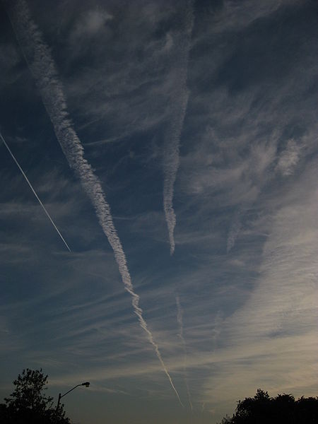 Wikipedia, Contrails (short for "condensation trails") or vapour trails are visible trails of condensed water vapour made by the exhaust of aircraft engines. As the hot exhaust gases cool in the surrounding air they may precipitate a cloud of microscopic water droplets. If the air is cold enough, this trail will comprise tiny ice crystals. The wingtip vortices which trail from the wingtips and wing flaps of aircraft are sometimes partly visible due to condensation in the cores of the vortices. Each vortex is a mass of spinning air and the air pressure at the centre of the vortex is very low. These wingtip vortices are not the same as contrails. Depending on atmospheric conditions, contrails may be visible for only a few seconds or minutes, or may persist for many hours. Contrails from a Qantas jet, AustraliaCondensation from engine exhaustThe main products of hydrocarbon fuel combustion are carbon dioxide and water vapor. At high altitudes this water vapour emerges into a cold environment, and the local increase in water vapour can push the water content of the air past saturation point. The vapour then condenses into tiny water droplets and/or deposits into ice. These millions of tiny water droplets and/or ice crystals form the vapour trail or contrails. The energy drop (and therefore, time and distance) the vapour needs to condense accounts for the contrail forming some way behind the aircraft's engines. The majority of the cloud content comes from water trapped in the surrounding air. At high altitudes, supercooled water vapour requires a trigger to encourage deposition or condensation. The exhaust particles in the aircraft's exhaust act as this trigger, causing the trapped vapour to rapidly turn to ice crystals. Exhaust vapour trails or contrails usually occur above 8000 metres (26,000 feet). where the temperature is below -40°C (-40°F). Condensation from decreases in pressureWhen a wing is generating lift it causes a vortex to form at each wingtip, and sometimes also at the tip of each wing flap. These wingtip vortices persist in the atmosphere long after the aircraft has passed. The reduction in pressure and temperature across each vortex can cause water to condense and make the cores of the wingtip vortices visible. This effect is more common on humid days. Wingtip vortices can sometimes be seen behind the wing flaps of airliners during takeoff and landing, and during landing of the Space shuttle. The visible cores of wingtip vortices contrast with the other major type of contrails which are caused by the combustion of fuel. Contrails produced from jet engine exhaust are seen at high altitude, directly behind each engine. In contrast, the visible cores of wingtip vortices are usually seen only at low altitude where the aircraft is travelling slowly after takeoff or before landing, and where the ambient humidity is higher. They trail behind the wingtips and wing flaps rather than behind the engines. During high-thrust settings the fan blades at the intake of a turbo-fan engine reach transonic speeds, causing a sudden drop in air pressure. This creates the condensation fog (inside the intake) which is often observed by air travelers during takeoff. For more information see the Prandtl–Glauert singularity effect. Vapour trails or contrails and climate