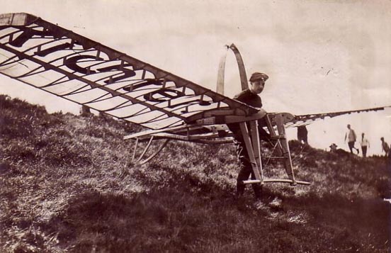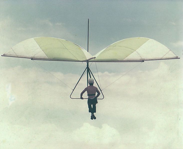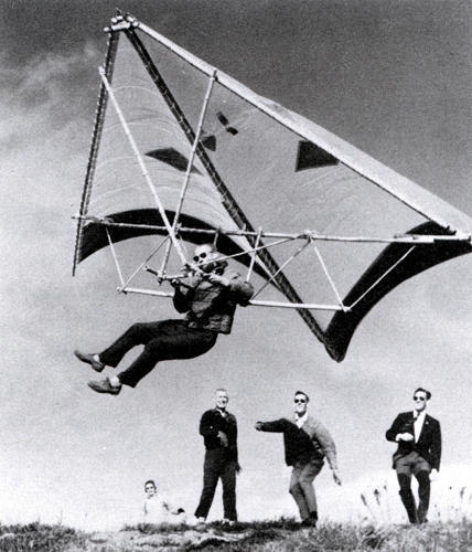 The sleek high performance jets, sailplanes and hang gliders of today have a heritage that dates back to man’s first attempts at flight. The Chinese Daoist writer Ge Hong (284–364 AD) wrote that kite vehicles with frames made of wood from the jujube tree had ox-leather straps "fastened to returning blades" that could allow the device to soar high into the air. As a form of execution, the notoriously cruel Emperor Wenxuan of Northern Qi (r. 550–559) had members of the rival Yuan and Tuoba clans attached to kites and launched from the top of the Tower of the Golden Phoenix in the capital, Ye, China, as test pilots; Yuan Huangtou (d. 559) glided for a while and survived the landing, but he was executed shortly after. The Venetian traveler Marco Polo (1254–1324) wrote that "some fool or drunkard" of the crew of a Chinese ship was the standard candidate to be strapped into a man-flying kite (which he called a "hurdle" made of willow stems attached to eight cords), which served the purpose of fortune-telling (i.e. they believed that if the man strapped to the kite rose fine, a prosperous voyage was ahead, if not, no foreign merchant would make deals with them). There are accounts of two attempts at flight by a Abbas Ibn Firnas near Cordoba, Spain in the 9th century. His first, in 852 CE, was a parachute jump using a huge wing-like cloak to break his fall; the second, in 875 CE, at the age of 70, employed a rudimentary glider. Both efforts ended in crashes and injury. It is possible that word of Ibn Firnas' wing-like parachute reached the monk Eilmer of Malmesbury of England, a scholar of mathematics and astrology. A fellow monk and historian, William of Malmesbury, reported that Eilmer flew off the roof of an Abbey in Malmesbury, England sometime between 1000 and 1010 AD, gliding about 200 metres (220 yd) before crashing, breaking a leg. The Kraków Museum of Ethnography in Poland claims that in 1866, painter and carpenter Jan Wnęk completed construction of an ash wood glider frame which he covered with linen impregnated with varnish and that Wnęk was firmly strapped to the glider by the chest and hips. It is claimed but not verified, that Jan Wnęk made several public flights from the local church tower during 1866-1869. Starting in the 1880s advancements were made in aerodynamics and construction that led to the first truly practical gliders; this information was often shared and published by early aviators and inventors, building a long series of incremental achievements. Through the 1880’s several aviation pioneers emerged in different countries around the world all perusing glider designs with varying degrees of success. Chief among these were Otto Lilienthal in Berlin, Germany, Lawrence Hargrave in Sydney, Australia, Percy Pilcher in the United Kingdom, John Joseph Montgomery at Otay Mesa near San Diego, California (1880s) as well as at Santa Clara, California (1905) Octave Chanute and his team in Gary, Indiana in the U.S.A., just to name a few. Otto Lilienthal duplicated some of his contemporaries' work and greatly expanded on it from 1874, publishing all of his research in 1889.He also produced a series of gliders, and in 1891 was able to make flights of 25 metres (82 ft) or more routinely, as well as some soaring flights. He rigorously documented his work, influencing later designers; for this reason he is one of the best known and influential of the early aviation pioneers. His type of aircraft is now known as a hang glider. By 1896 he had made about 2000 flights on a number of his designs when he crashed from a height of roughly 17 metres (56 ft) fracturing his spine. Percy Pilcher took a growing interest in aviation and built a glider called The Bat which he flew for the first time in 1895. Later that year Pilcher met and consulted with Otto Lilienthal, who was the leading expert in gliding; these discussions led to Pilcher building two more hang gliders, The Beetle and The Gull. Based on the work of his mentor Otto Lilienthal, in 1897 Pilcher built a third hang glider called The Hawk with which he broke the world distance record when he flew 250 metres (820 ft). WasserkuppeThe hang glider lost some importance through the introduction of wing warping in 1902 by the Wright brothers and subsequently of aileron control by the French. When the World War I ended in 1918, the Treaty of Versailles practically ended engine driven flights in Germany, thus, in the 1920s and 1930s, while aviators and aircraft makers in the rest of the world were working to improve the performance of powered aircraft, the Germans were designing, developing and flying ever more efficient gliders and discovering ways of using the natural forces in the atmosphere to make them fly farther and faster. These activities on Wasserkuppe promoted a renaissance of gliding aviation. Many of these gliders flown in 1920 were hang gliders in that they were controlled by the pilot's weight shift alone. The first Wasserkuppe glider competition was held in 1920 and from 1924 they were organised by Rhön-Rossitten Gesellschaft. Over the next decade, the contest grew in popularity. As many as 70 glider clubs from Europe sent their best gliders and pilots to compete for duration, altitude and distance prizes, the most coveted prize was that donated by President von Hindenburg. As many as 60,000 spectators dotted the mountain slopes to watch these events. Virtually every European aeronautical engineer of the time tested and modified their aircraft there and reports were generated. Some competing hang glider designers were Alfried Gymnich, Gottlob Espenlaub, Alexander Lippisch, Heinz Schneider, Francis Chardon, Willi Pelzner, Hans Richterand Segelflieger Peltzner, while engineer Henri Mignet was busy in France and Czesław Tański was busy in Turkey. Invention of the flexible wingOn 1948, aeronautical engineer Francis Rogallo invented a self-inflating wing which he patented on March 20, 1951 as the Flexible Wing, also kn