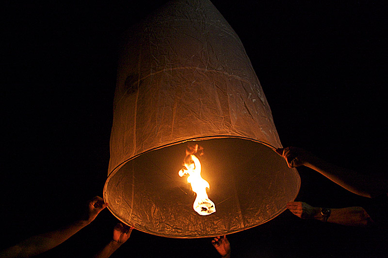 According to popular lore, the Kongming Lantern (Chinese: 孔明灯) was the first hot air balloon, said to be invented by the sage and military strategist Zhuge Liang, whose reverent term of address (i.e. Chinese style name) was Kongming. They were first deployed at the turn of the 3rd century as a type of signalling balloon or, it is claimed, as a type of spy blimp in warfare. Alternately the name may come from the lantern's resemblance to the hat Kongming is traditionally shown to be wearing. It is likely that this technological discovery is misattributed because of the Chinese historical practice of attributing great discoveries to significant historical figures rather than to the actual inventors. According to the sinologist and historian of science Joseph Needham, the Chinese experimented with mini-hot air balloons from as early as the 3rd century BC - which suggests that the attribution of its invention to Kongming is indeed apocryphal. Usage in festivalsLater non-military applications were employed as they became popular with children at carnivals. These lanterns were subsequently incorporated into festivals like the Chinese Mid-Autumn and Lantern Festivals. Pingsi in the Taipei County of Taiwan holds an annual Lantern Festival in which sky lanterns are released. The people of Northern Thailand also have a variation on sky lanterns. These are known as Khoom Loy. Northern Thai people use sky lanterns all year round, for celebrations and other special occasions. One festival in particular is the Loy Kratong festival in which lovers and partners gather on the riverbanks to float flowers and candles, launch fireworks and release sky lanterns together. It is considered good luck to release a sky lantern, and many Thais believe they are symbolic of problems and worries floating away. DangersAs sky lanterns contain a flame, there is the danger that they can cause a fire when landing on inflammable ground. See alsoExternal links