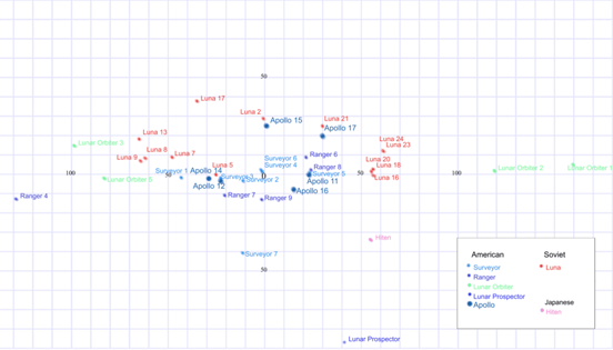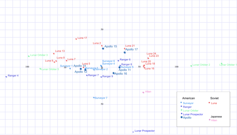Grid showing location of artificial objects on the moon (axis shows latitude and longitude) |