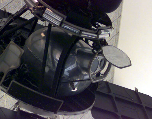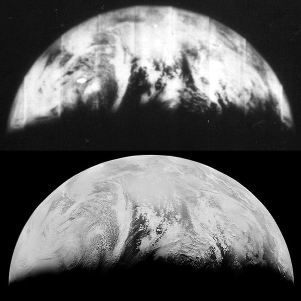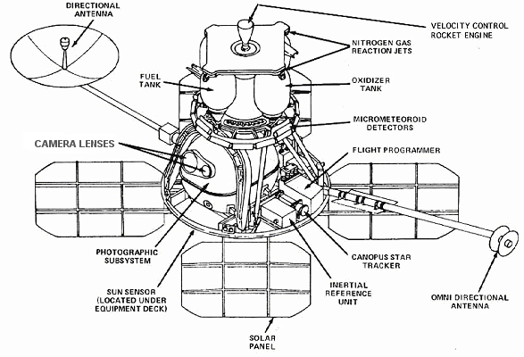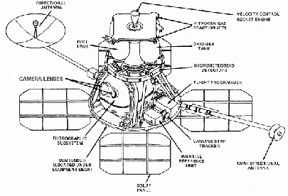 Wikipedia, The Lunar Orbiter program was a series of five unmanned Lunar orbiter missions launched by the United States in 1966 through 1967 with the purpose of mapping the lunar surface before the Apollo landings.All five missions were successful, and 99% of the Moon was photographed with a resolution of 60 m or better. The first three missions were dedicated to imaging 20 potential lunar landing sites, selected based on Earth based observations. These were flown at low inclination orbits. The fourth and fifth missions were devoted to broader scientific objectives and were flown in high altitude polar orbits. Lunar Orbiter 4 photographed the entire nearside and 95% of the farside, and Lunar Orbiter 5 completed the farside coverage and acquired medium (20 m) and high (2 m) resolution images of 36 pre-selected areas. The Lunar Orbiters had an ingenious imaging system, which consisted of a dual lens camera, a film processing unit, a readout scanner, and a film handling apparatus. Both lenses, a 610 mm narrow angle high resolution (HR) lens and an 80 mm wide angle medium resolution (MR) lens, placed their frame exposures on a single roll of 70 mm film. The axes of the two cameras were coincident so the area imaged in the HR frames were centered within the MR frame areas. The film was moved during exposure to compensate for the spacecraft velocity, which was estimated by an electro-optical sensor. The film was then processed, scanned, and the images transmitted back to Earth. During the Lunar Orbiter missions the first pictures of the planet Earth as a whole were taken, Earthrise over the Lunar surface by Lunar Orbiter 1 and a full picture of the Earth by Lunar Orbiter 5. Spacecraft and subsystemsThe main bus of the Lunar Orbiter had the general shape of a truncated cone, 1.65 metres tall and 1.5 m in diameter at the base. The spacecraft was composed of three decks supported by trusses and an arch. The equipment deck at the base of the craft held the battery, transponder, flight progammer, inertial reference unit (IRU), Canopus star tracker, command decoder, multiplex encoder, traveling wave tube amplifier (TWTA), and the photographic system. Four solar panels were mounted to extend out from this deck with a total span across of 3.72 m. Also extending out from the base of the spacecraft were a high gain antenna on a 1.32 m boom and a low gain antenna on a 2.08 m boom. Above the equipment deck, the middle deck held the velocity control engine, propellant, oxidizer and pressurization tanks, Sun sensors, and micrometeoroid detectors. The third deck consisted of a heat shield to protect the spacecraft from the firing of the velocity control engine. The nozzle of the engine protruded through the center of the shield. Mounted on the perimeter of the top deck were four attitude control thrusters. Power of 375 W was provided by the four solar arrays containing 10,856 n/p solar cells which would directly run the spacecraft and also charge the 12 A·h nickel-cadmium battery. The batteries were used during brief periods of occultation when no solar power was available. Propulsion for major maneuvers was provided by the gimballed velocity control engine, a hypergolic 100 pound-force (445 N) thrust Marquardt rocket motor. Three axis stabilization and attitude control were provided by four one lbf (4 N) nitrogen gas jets. Navigational knowledge was provided by five Sun sensors, Canopus star sensor, and the IRU equipped with internal gyros. Communications were via a 10 W transmitter and the directional 1 m diameter high gain antenna for transmission of photographs and a 0.5 W transmitter and omnidirectional low gain antenna for other communications. Both antennas operated in S-band at 2295 MHz. Thermal control was maintained by a multilayer aluminized Mylar and Dacron thermal blanket which enshrouded the main bus, special paint, insulation, and small heaters. Results of the Lunar Orbiter ProgramThe Lunar Orbiter program consisted of five Lunar Orbiters which returned photography of 99% of the surface of the Moon (near and far side) with resolution down to 1 meter. Altogether the Orbiters returned 2180 high resolution and 882 medium resolution frames. The micrometeoroid experiments recorded 22 impacts showing the average micrometeoroid flux near the Moon was about two orders of magnitude greater than in interplanetary space but slightly less than the near Earth environment. The radiation experiments confirmed that the design of Apollo hardware would protect the astronauts from average and greater than average short term exposure to solar particle events. The use of Lunar Orbiters for tracking to evaluate the Manned Space Flight Network tracking stations and Apollo Orbit Determination Program was successful, with three Lunar Orbiters (2, 3, and 5) being tracked simultaneously from August to October 1967. The Lunar Orbiters were all eventually commanded to crash on the Moon before their attitude control gas ran out so they would not present navigational or communications hazards to later Apollo flights. The Lunar Orbiter program was managed by NASA Langley Research Center at a total cost of roughly $200 million.