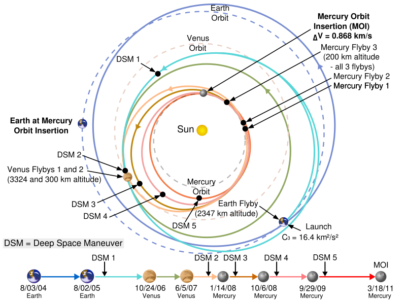 The MErcury Surface, Space ENvironment, GEochemistry and Ranging (MESSENGER) probe is a NASA spacecraft, launched August 3, 2004 to study the characteristics and environment of Mercury from orbit. Specifically, the mission is to characterize the chemical composition of Mercury's surface, the geologic history, the nature of the magnetic field, the size and state of the core, the volatile inventory at the poles, and the nature of Mercury's exosphere and magnetosphere over a nominal orbital mission of one Earth year. The mission is the first to visit Mercury in over 30 years; the only previous probe to visit Mercury was Mariner 10, which completed its mission in March 1975. The MESSENGER has vastly improved scanning capability, with cameras capable of resolving surface features to 18 m (59 ft) across compared to the 1.6 km (0.99 mi) resolution of the Mariner 10. MESSENGER is an orbital mission, and will spend over a year imaging the entire planet; Mariner 10 was a flyby mission and was only able to observe the one hemisphere that was lit during its flybys. The contrived acronym MESSENGER was chosen because Mercury was the messenger of the gods according to Roman mythology. Travel to MercuryThe Boeing Delta II rocket carrying MESSENGER lifted off from Cape Canaveral Air Force Station, Florida at 02:15:56 EDT on August 3, 2004. An hour later, NASA confirmed that MESSENGER had successfully separated from the third stage booster and commenced its roundabout route to Mercury. Travel to Mercury requires an extremely large velocity change, or delta-v, because Mercury lies deeper in the Sun's gravity well; a spacecraft traveling to Mercury is greatly accelerated as it falls toward the Sun, so there must be a mechanism to slow it. Mercury does not have an atmosphere thick enough to aerobrake on arrival. To make the trip feasible, MESSENGER makes extensive use of gravity assist maneuvers. These reduce the amount of rocket fuel needed to slow down, but greatly prolong the trip. For additional fuel savings, the thrust used for insertion into orbit about Mercury will be minimized, resulting in a notably elliptical orbit. Besides the advantage of saving fuel, such an orbit allows the spacecraft to measure solar wind and magnetic fields at a variety of distances from the planet, yet still get close-up measurements and photographs of the surface. MESSENGER performed a successful Earth swing-by a year after launch, on 2 August 2005, with the closest approach at 19:13 UTC at an altitude of 2,347 kilometers (1,458 statute miles) over central Mongolia. On December 12, 2005, a 524 second long burn ('Deep-Space Maneuver' or 'DSM-1') of the large thruster adjusted the trajectory for the upcoming Venus swing-by. MESSENGER made its first flyby of Venus at 08:34 UTC on October 24, 2006 at an altitude of 2,992 kilometers (1,859 mi). A second flyby of Venus was made at 23:08 UTC on June 5, 2007 at an altitude of 338 kilometers (210 mi). On October 17, 2007, 'Deep-Space Maneuver-2' or 'DSM-2' was executed successfully, putting MESSENGER on target for its first flyby of Mercury. MESSENGER made a flyby of Mercury on 14 January 2008 (closest approach 200 km above surface of Mercury at 19:04:39 UTC), followed by a second flyby on October 6, 2008. MESSENGER will execute one last flyby on September 29, 2009, to further slow down the spacecraft. Mercury orbit insertion will be on March 18, 2011, beginning a year-long orbital mission. During the Earth flyby, MESSENGER imaged the Earth and Moon and used its atmospheric and surface composition spectrometer to look at the Moon. The particle and magnetic field instruments investigated the Earth's magnetosphere. The spacecraft was originally scheduled to launch during a 12-day window that opened May 11, 2004, but on March 26, 2004, NASA announced that a later launch window starting at July 30, 2004 with a length of 15 days would be used. This was to allow more time for testing and spacecraft processing. This change significantly altered the trajectory of the mission and delayed the arrival at Mercury by two years. The original plan called for three fly-by maneuvers past Venus, with Mercury orbit insertion scheduled for 2009. The new trajectory features one Earth flyby, two Venus flybys, and three Mercury flybys before orbit insertion on March 18, 2011. The navigation team is led by KinetX, Inc. of Tempe, AZ. KinetX is the first private company to be responsible for navigation of a NASA deep space mission. In that role, they are responsible for determining all trajectory adjustments throughout the probe's flight through the inner solar system ensuring that MESSENGER arrives at Mercury with the proper velocity for orbit insertion. Mercury observation plan