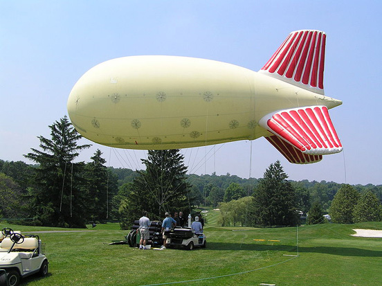 A blimp, or non-rigid airship, is an airship without an internal supporting framework or keel. A non-rigid airship differs from a semi-rigid and a rigid airship (e.g. a Zeppelin) in that it does not have any rigid structure, neither a complete framework nor a partial keel, to help the airbag maintain its shape. Rather, these aircraft rely on both a higher pressure of the lifting gas (usually helium) inside the envelope and the strength of the envelope itself. The term 'blimp' refers only to free flying aircraft. The term is sometimes, but erroneously, used to refer to the tethered craft known as moored balloons. While often very similar in shape, moored balloons have no propulsion and are tethered to the ground. PrincipleBecause blimps keep their shape with internal overpressure, typically the only solid parts are the passenger car (gondola) and the tail fins. A non-rigid-airship that uses heated air instead of a light gas (such as Helium) as a lifting medium is called a hot air airship.