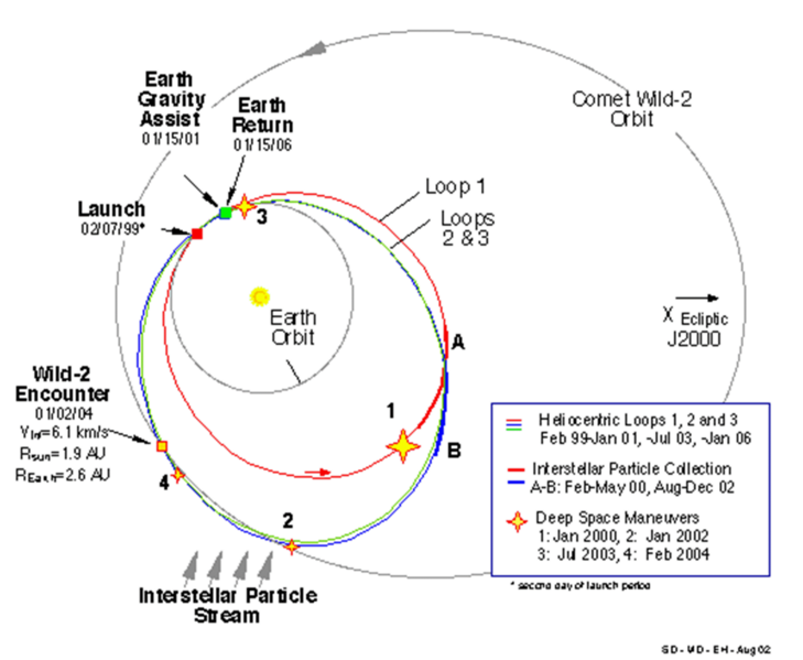 Stardust is an American interplanetary mission of the NASA Jet Propulsion Laboratory, whose primary purpose was to investigate the makeup of the comet Wild 2 and its coma. It was launched on February 7, 1999 by NASA, travelled nearly 3 billion miles (5·10 km), and returned to Earth on January 15, 2006 to release a sample material capsule. It is the first sample return mission to collect cosmic dust and return the sample to Earth. On July 3, 2007 a second mission was approved to revisit the comet Tempel 1. Primary mission