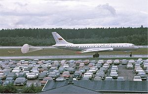 The Tupolev Tu-104 (NATO reporting name: Camel) was a twin-engined medium-range turbojet-powered Soviet airliner. After the British de Havilland Comet, Canadian Avro Jetliner, and the French Sud Caravelle, the Tu-104 was the fourth jet airliner to fly, and the second to enter regular service. It was also the sole jetliner in service in the world from 1954 to 1958. Design and developmentAt the beginning of the 1950s, the Soviet Union's Aeroflot airline desperately needed a modern airliner with better capacity and performance than any other Soviet plane then in operation. The design request was filled by the Tupolev OKB, which based their new airliner on its Tu-16 'Badger' strategic bomber, the first version was more similar to the Tu-16 and it got square windows like the early De Havilland Comet, but this was later changed before the airplane made its maiden flight. The airplane was pressure tested in a watertank. The wings, engines, and tail surfaces of the Tu-16 were retained in the airliner, but the new design adopted a wider, pressurised fuselage to accommodate 50 passengers. The prototype (CCCP-L5400) first flew on June 17, 1955 with Yu.L. Alasheyev at the controls at Kharkiv plant in Ukraine. It was fitted with a drogue parachute which could shorten the landing run by up to 400 metres (1,300 ft). Its arrival in London during a 1956 state visit by Nikolai Bulganin and Nikita Khrushchev shocked Western observers who, by the time, thought the Soviets lacked the advanced technology needed to build a commercial airliner with such performance. The Tu-104 was powered by two Mikulin AM-3 turbojets placed at the wing/fuselage junction (similar to the de Havilland Comet). The crew needed to fly her consisted of 5 people: 2 pilots, 1 navigator (placed in the glazed "bomber" nose), 1 flight engineer and 1 radio operator. This airplane raised great curiosity by its lavish "Victorian" interior - called so by some Western-hemisphere observers - due to the materials used: mahogany, copper and lace. On September 15, 1956, it began revenue service in Aeroflot's Moscow-Omsk-Irkutsk route, replacing the old Ilyushin Il-14. The flight time was reduced from 13 hours and 50 minutes to 7 hours and 40 minutes. In 1957, CSA became the first foreign airline to operate the Tu-104 in the routes with Moscow, Paris and Brussels as destinations. The small capacity (50 passengers) and the excessive strength and therefore weight inherited from the Tupolev Tu-16 were some of the reasons for its low profitability. By the time production ceased in 1960, about 200 had been built. Aeroflot did not retire the Tu-104 from civil service until 1979, and the aircraft continued to serve in the Soviet Air Force until 1981, when a crash showed it to be unsafe. The last flight of the type was a ferry flight to a museum in 1986. CSA Czechoslovak Airlines, the Czechoslovak national airline, bought six (four new and two used) of Tu-104As configured for 81 passengers.