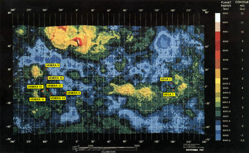 Wikipedia, The Venera series of probes was developed by the USSR between 1961 and 1984 to gather data from Venus. As with some of the USSR's other planetary probes, the later versions were launched in pairs with a second vehicle being launched soon after the first of the pair. Ten probes from the Venera series successfully landed on Venus and transmitted data from the surface, including the two, Vega program and Venera-Halley probes. In addition, thirteen Venera probes successfully transmitted data from the atmosphere of Venus. Among the other results, probes of the series became the first man-made devices to enter the atmosphere of another planet (Venera 4 on October 18, 1967), to make a soft landing on another planet (Venera 7 on December 15, 1970), to return images from the planetary surface (Venera 9 on June 8, 1975), and to perform high-resolution radar mapping studies of Venus (Venera 15 on June 2, 1983). So, the entire series could be considered as highly successful. Unfortunately the surface conditions on Venus are extreme, which meant that the probes did not survive more than about an hour. Venera is the Russian name for Venus. The Venera probesVenera 3 to 6The Venera 3 to 6 probes were similar. Weighing approximately one ton, and launched by the Molniya -type booster rocket, they included a cruise "bus" and a spherical atmospheric entry probe. The probes were optimised for atmospheric measurements, but not equipped with any special landing apparatus. Although it was hoped they would reach the surface still functioning, the first probes failed almost immediately, thereby disabling data transmission to Earth. Venera 3 became the first manmade object to impact another planet's surface as it crash-landed on March 1, 1966. However, as the spacecraft's dataprobes had failed upon atmospheric penetration, no data from within the Venusian boundary was retrieved from the mission. On 18 October 1967, Venera 4 became the first spacecraft to measure the atmosphere of another planet. While the Soviet Union initially claimed the craft reached the surface intact, re-analysis including atmospheric occultation data from the American Mariner 5 spacecraft that flew by Venus the day after its arrival demonstrated that Venus's surface pressure was 75-100 atmospheres, much higher than Venera 4's 25 atm hull strength, and the claim was retracted. Realizing the ships would be crushed before reaching the surface, the Soviets launched Venera 5 and Venera 6 as atmospheric probes. Designed to jettison nearly half their payload prior to entering the planet's atmosphere, these craft recorded 53 and 51 minutes of data, respectively, before their batteries failed. Venera 7The Venera 7 probe was the first one designed to survive Venus surface conditions and to make a soft landing. Massively overbuilt to ensure survival, it had few experiments on board, and scientific output from the mission was further limited due to an internal switchboard failure which stuck in the "transmit temperature" position. Still, the control scientists succeeded in extrapolating the pressure (90 atm) from the temperature data (465 °C (869 °F)), which resulted from the first direct surface measurements. The Doppler measurements of the Venera 4 to 7 probes were the first evidence of the existence of high-speed zonal winds (up to 100 metres per second (330 ft/s)) in the Venus atmosphere (super rotation). Venera 7's parachute failed shortly before landing, fortunately very close to the surface. It impacted at 17 metres per second (56 ft/s) and toppled over, but survived. Due to the resultant antenna misalignment, the radio signal was very weak, but was detected (with temperature telemetry) for 23 more minutes before its batteries expired. Thus, it became, on 15 December 1970, the first man-made probe to transmit data from the surface of another planet. Venera 8Venera 8 was equipped with an extended set of scientific instruments for studying the surface (gamma-spectrometer etc.). The cruise bus of Venera 7 and 8 was similar to that of earlier ones, with the design ascending to the Zond 3 mission. Venera 9 to 12The Venera 9 to 12 probes were of a different design. They weighed approximately five tons and were launched by the powerful Proton booster. They included a transfer and relay bus that had engines to brake into Venus orbit (Venera 9 and 10, 15 and 16) and to serve as receiver and relay for the entry probe's transmissions. The entry probe was attached to the top of the bus in a spherical heat shield. The probes were optimized for surface operations with an unusual looking design that included a spherical compartment to protect the electronics from atmospheric pressure and heat for as long as possible. Beneath this was a shock absorbing "crush ring" for landing. Above the pressure sphere was a cylindrical antenna structure and a wide dish shaped structure that resembled an antenna but was actually an aerobrake. They were designed to operate on the surface for a minimum of 30 minutes. Instruments varied on different missions, but included cameras and atmospheric and soil analysis equipment. Venera 13 and 14Venera 13 and Venera 14 were identical spacecraft built to take advantage of the 1981 Venus launch opportunity and launched 5 days apart in late 1981. Each mission consisted of a bus and an attached descent craft. The journey to Venus took a little over 4 months, at the end of which, in early March 1982, the descent vehicle separated from the bus and plunged into the Venus atmosphere. The descent craft/lander contained most of the instrumentation and electronics, and was topped by an antenna. The design was similar to the earlier Venera 9–12 landers. They carried instruments to take scientific measurements of the ground and atmosphere once landed, including cameras, a microphone, a drill and surface sampler, and a seismometer. They also had instruments to record electric discharges during its descent phase through the Venusian atm