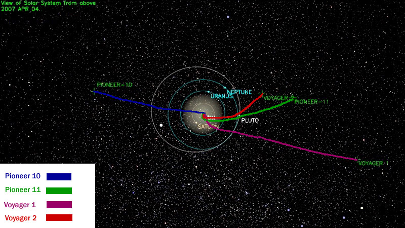 Uranus is the third largest planet in the solar system. It orbits the Sun at a distance of about 2.8 billion kilometers (1.7 billion miles) and completes one orbit every 84 years. The length of a day on Uranus as measured by Voyager 2 is 17 hours, 14 minutes. Uranus is distinguished by the fact that it is tipped on its side. Its unusual position is thought to be the result of a collision with a planet-sized body early in the solar system's history. Given its odd orientation, with its polar regions exposed to sunlight or darkness for long periods, scientists were not sure what to expect at Uranus. Voyager 2 found that one of the most striking influences of Uranus' sideways position is its effect on the tail of the magnetic field, which is itself tilted 60 degrees from the planet's axis of rotation. The magnetotail was shown to be twisted by the planet's rotation into a long corkscrew shape behind the planet. The presence of a magnetic field at Uranus was not known until Voyager's arrival. Radiation belts at Uranus were found to be of an intensity similar to those at Saturn. The intensity of radiation within the belts is such that irradiation would quickly darken (within 100,000 years) any methane trapped in the icy surfaces of the inner moons and ring particles. This may have contributed to the darkened surfaces of the moons and ring particles, which are almost uniformly gray in color. A high layer of haze was detected around the sunlit pole, which also was found to radiate large amounts of ultraviolet light, a phenomenon dubbed "dayglow." The average temperature is about 60 kelvins (−350 degrees Fahrenheit/−213 degrees Celsius). Surprisingly, the illuminated and dark poles, and most of the planet, show nearly the same temperature at the cloud tops. The moon Miranda, innermost of the five large moons, was revealed to be one of the strangest bodies yet seen in the solar system. Detailed images from Voyager's flyby of the moon showed huge fault canyons as deep as 20 kilometers (12 miles), terraced layers, and a mixture of old and young surfaces. One theory holds that Miranda may be a reaggregation of material from an earlier time when the moon was fractured by a violent impact. All nine previously known rings were studied by the spacecraft and showed the Uranian rings to be distinctly different from those at Jupiter and Saturn. The ring system may be relatively young and did not form at the same time as Uranus. Particles that make up the rings may be remnants of a moon that was broken by a high-velocity impact or torn up by gravitational effects. NeptuneThe closest appoach to Neptune occurred on August 25, 1989. Since this was the last major planet Voyager 2 could visit, it was decided to make a close flyby of the moon Triton, regardless of the consequences to the trajectory, as with Voyager 1's encounter with Saturn and its moon Titan. The probe also discovered the Great Dark Spot, which has since disappeared, according to Hubble Space Telescope observations. Originally thought to be a large cloud itself, it was later postulated to be a hole in the visible cloud deck. For many years, beginning in the late 19th century, it was widely believed that an unseen planet (dubbed "Planet X") was influencing Uranus and Neptune, as their observed and predicted positions differed. This belief brought about the 1930 discovery of Pluto, and persisted as it became increasingly clear that Pluto does not have the mass to account for these discrepancies. When Voyager 2 passed Neptune, it became possible to precisely measure Neptune's mass. Neptune turned out to be 0.5% less massive than previously believed, a difference comparable to the entire mass of Mars. When Uranus and Neptune's orbits were recalculated using the most accurate figure, it became clear that the erroneous mass figure - not the gravity of an unseen planet - caused the orbital discrepancies which had long vexed the astronomical community. With the 2006 decision of the International Astronomical Union to reclassify Pluto as a "dwarf planet", the 1989 flyby of Neptune by Voyager 2 became the point when every planet in the solar system had been visited at least once by spacecraft. Escaping the solar systemSince its planetary mission is over, Voyager 2 is now described as working on an interstellar mission, which NASA is using to find out what the solar system is like beyond the heliosphere. Like Voyager 1 around three years before, Voyager 2 crossed into the heliosheath, the last section of the heliosphere before interstellar space, in October 2007. As of September 2008, Voyager 2 was at a distance of around 87.03 AU (13.019 billion km, 8.077 billion miles, or 0.0013761 ly) from the Sun , deep in the scattered disc, and traveling outward at roughly 3.28 AUs per year.It is more than twice as far from the Sun as Pluto, and far beyond the perihelion of 90377 Sedna, but not yet beyond the outer limits of the orbit of Eris. On August 30, 2007, Voyager 2 passed the termination shock into the heliosheath, approximately 1 billion miles (1.6 billion km) closer to the Sun than Voyager 1 did. This is due to the local interstellar magnetic field of deep space. The southern hemisphere of the solar system's heliosphere is being pushed in. Voyager 2 is not headed toward any particular star. It will pass by the 2.6 parsec distant star Sirius at a distance of 1.32 parsecs (4.3 ly, 25 trillion mi) in about 296,000 years. Each Voyager carries a gold-plated audio-visual disc in the event that either spacecraft is ever found by intelligent aliens. The disc carries images of Earth and its lifeforms, a range of scientific information, and a medley, "Sounds of Earth", that includes the sounds of whales, a baby crying, waves breaking on a shore and a variety of music. Voyager 2 is expected to keep transmitting until at least after 2025, over 48 years since launch.