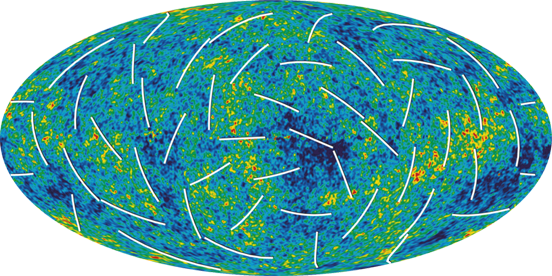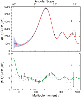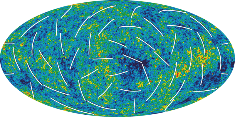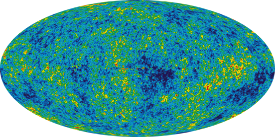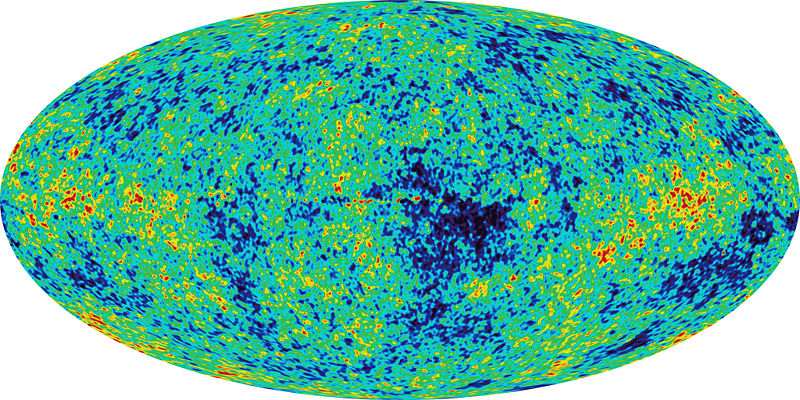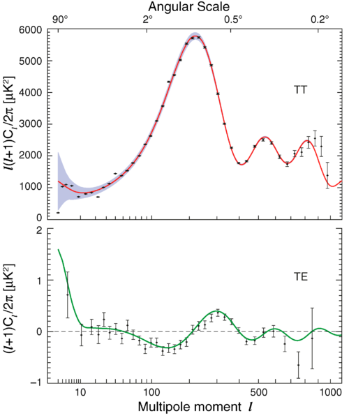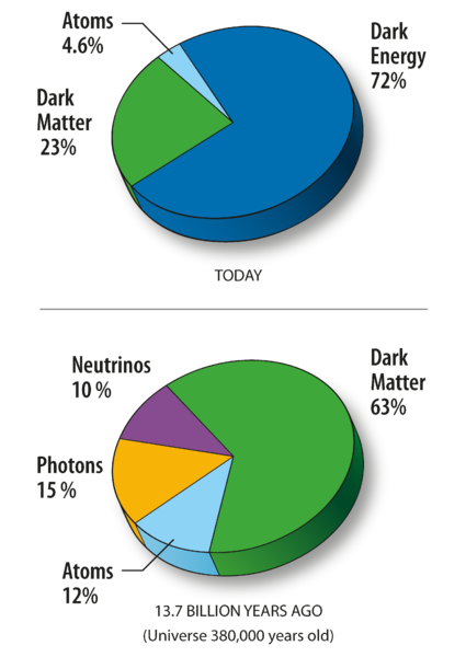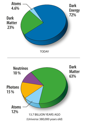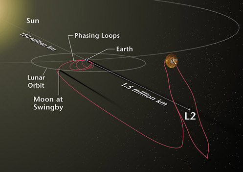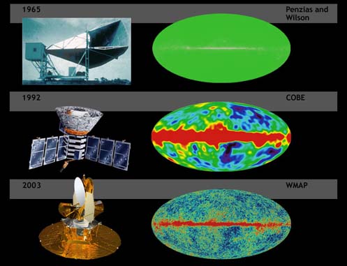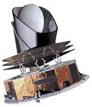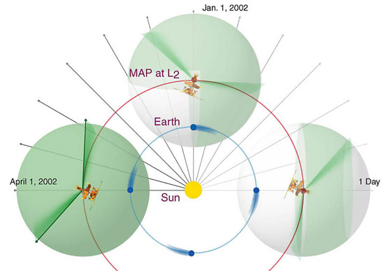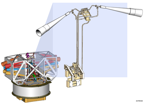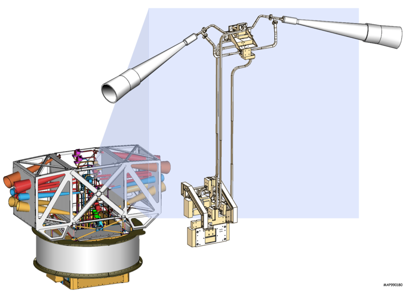 The MAP mission was proposed to NASA in 1995, selected for definition study in 1996, and approved for development in 1997. The WMAP was preceded by two missions to observe the CMB; (i) the Soviet RELIKT-1 that reported the upper-limit measurements of CMB anisotropies, and (ii) the U.S. COBE satellite that reported large-scale CMB fluctuations, and the ground-based and balloon experiments measuring the small-scale fluctuations in patches of sky: the Boomerang, the Cosmic Background Imager, and the Very Small Array. The WMAP is 45 times more sensitive, with 33 times the angular resolution of its COBE satellite predecessor. The spacecraftThe telescope's primary reflecting mirrors are a pair of Gregorian 1.4m x 1.6m dishes (facing opposite directions), that focus the signal onto a pair of 0.9m x 1.0m secondary reflecting mirrors. They are shaped for optimal performance: a carbon fibre shell upon a Korex core, thinly-coated with aluminium and silicon oxide. The secondary reflectors transmit the signals to the corrugated feedhorns that sit on a focal plane array box beneath the primary reflectors. The receivers are differential radiometers (sensitive to polarization) measuring the difference between a two telescope beams. The signal is amplified with HEMT low-noise amplifiers. There are 20 feeds, 10 in each direction, from which a radiometer collects a signal; the measure is the difference in the sky signal from opposite directions. The directional separation azimuth is 180 degrees; the total angle is 141 degrees. To avoid collecting Milky Way galaxy foreground signals, the WMAP uses five discrete radio frequency bands, from 23GHz to 94GHz. The WMAP's base is a 5.0m-diameter solar panel array that keeps the instruments in shadow during CMB observations, (by keeping the craft constantly angled at 22 degrees, relative to the sun). Upon the array sit a bottom deck (supporting the warm components) and a top deck. The telescope's cold components: the focal-plane array and the mirrors, are separated from the warm components with a cylindrical, 33 cm-long thermal isolation shell atop the deck. Passive thermal radiators cool the WMAP to ca. 90 degrees K; they are connected to the low-noise amplifiers. The telescope consumes 419 W of power. The available telescope heaters are emergency-survival heaters, and there is a transmitter heater, used to warm them when off. The WMAP spacecraft's temperature is monitored with platinum resistance thermometers. The WMAP's calibration is effected with the CMB dipole and measurements of Jupiter; the beam patterns are measured against Jupiter. The telescope's data are relayed daily via a 2GHz transponder providing a 667kbit/s downlink to a 70m Deep Space Network telescope. The spacecraft has two transponders, one a redundant back-up; they are minimally active — ca. 40 minutes daily — to minimize radio frequency interference. The telescope's position is maintained, in its three axes, with three reaction wheels, gyroscopes, two star trackers and sun sensors, and is steered with eight hydrazine thrusters. Launch, trajectory, and orbitThe WMAP spacecraft arrived at the Kennedy Space Center on 20 April 2001. After being tested for two months, it was launched via Delta II 7425 rocket on 30 June 2001. It began operating on its internal power five minutes before its launching, and so continued operating until the solar panel array deployed. The WMAP was activated and monitored while it cooled. On 2 July, it began working, first with in-flight testing (from launching 'til 17 August), then began constant, formal work. Afterwards, it effected three Earth-Moon phase loops, measuring its sidelobes, then flew by the Moon on 30 July, enroute to the the L2 Sun-Earth Lagrangian point, arriving there on 1 October 2001, becoming, thereby, the first CMB observation mission permanently posted there. The spacecraft's location at Lagrange 2, (1.5 million kilometers from Earth) minimizes the amount of contaminating solar, terrestrial, and lunar emissions registered, and to thermally stabilize it. To view the entire sky, without looking to the sun, the WMAP traces a path around L2 in a Lissajous orbit ca. 1.0 degree to 10 degrees, with a 6-month period. The telescope rotates once every 2 minutes, 9 seconds" (0.464 rpm) and processes at the rate of 1 revolution per hour. WMAP measures the entire sky every six months, and completed its first, full-sky observation in April 2002. Foreground radiation subtractionThe WMAP observes in five frequencies, permitting the measurement and subtraction of foreground contamination (from the Milky Way and extra-galactic sources) of the CMB. The main emission mechanisms are synchrotron radiation and free-free emission (dominating the lower frequencies), and astrophysical dust emissions (dominating the higher frequencies). The spectral properties of these emissions contribute different amounts to the five frequencies, thus permitting their identification and subtraction. Foreground contamination is removed in several ways. First, subtract extant emission maps from the WMAP's measurements; second, use the components' known, spectral values to identify them; third, simultaneously fit the position and spectra data of the foreground emission, using extra data sets. Foreground contamination also is reduced by using only the the full-sky map portions with the least foreground contamination, whilst masking the remaining map portions. Measurements and discoveriesOne-year data releaseOn 11 February 2003, based upon one year's worth of WMAP data, NASA published the latest calculated age, composition, and image of the universe to date, that "contains such stunning detail, that it may be one of the most important scientific results of recent years"; the data surpass previous CMB measurements. Based upon the Lambda-CDM model, the WMAP team produced cosmological parameters from the WMAP's first-year results. Three sets are given below; the first and second sets are WMAP