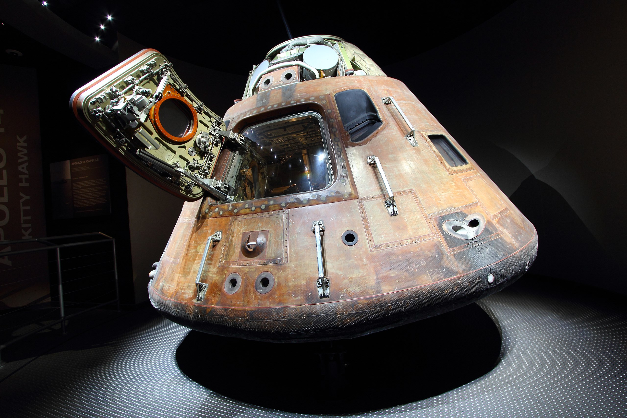 The 'Big Bertha' rock (Lunar Sample 14321) was the third largest rock collected during the Apollo program. A total of 94 pounds (43 kg) of Moon rocks, or lunar samples, were brought back from Apollo 14. Most are breccias, which are rocks composed of fragments of other, older rocks. Breccias form when the heat and pressure of meteorite impacts fuse small rock fragments together. There were a few basalts that were collected in this mission in the form of clasts (fragments) in breccia. The Apollo 14 basalts are generally richer in aluminum and sometimes richer in potassium than other lunar basalts. Most lunar mare basalts collected during the Apollo program were formed from 3.0 to 3.8 billion years ago. The Apollo 14 basalts were formed 4.0 to 4.3 billion years ago, older than the volcanism known to have occurred at any of the mare locations reached during the Apollo program. In January 2019 research showed that Big Bertha, which weighs 19.837 pounds (8.998 kg), has characteristics that make it likely to be a terrestrial (Earth) meteorite. Granite and quartz, which are commonly found on Earth but very rarely found on the Moon, were confirmed to exist on Big Bertha. To find the sample's age, the research team from Curtin University looked at bits of the mineral zircon embedded in its structure. "By determining the age of zircon found in the sample, we were able to pinpoint the age of the host rock at about four billion years old, making it similar to the oldest rocks on Earth," researcher Alexander Nemchin said, adding that "the chemistry of the zircon in this sample is very different from that of every other zircon grain ever analyzed in lunar samples, and remarkably similar to that of zircons found on Earth." This would mean Big Bertha is both the first discovered terrestrial meteorite and the oldest known Earth rock. Lunar orbit operationsRoosa spent almost two days alone aboard Kitty Hawk, performing the first intensive program of scientific observation from lunar orbit, much of which was intended to have been done by Apollo 13. After Antares separated and its crew began preparations to land, Roosa in Kitty Hawk performed an SPS burn to send the CSM to an orbit of approximately 60 nautical miles (110 km; 69 mi), and later a plane change maneuver to compensate for the rotation of the Moon. Roosa took pictures from lunar orbit. The Lunar Topographic Camera, also known as the Hycon camera, was supposed to be used to image the surface, including the Descartes Highlands site being considered for Apollo 16, but it quickly developed a fault with the shutter that Roosa could not fix despite considerable help from Houston. Although about half of the photographic targets had to be scrubbed, Roosa was able to obtain photographs of Descartes with a Hasselblad camera and confirm that it was a suitable landing point. Roosa also used the Hasselblad to take photographs of the impact point of Apollo 13's S-IVB near Lansburg B crater. After the mission, troubleshooting found a tiny piece of aluminum contaminating the shutter control circuit, which caused the shutter to operate continuously. Roosa was able to see sunlight glinting off Antares and view its lengthy shadow on the lunar surface on Orbit 17; on Orbit 29 he could see the sun reflecting off the ALSEP. He also took astronomical photographs, of the Gegenschein, and of the Lagrangian point of the Sun-Earth system that lies beyond the Earth (L2), testing the theory that the Gegenschein is generated by reflections off particles at L2. Performing the bistatic radar experiment, he also focused Kitty Hawk's VHF and S-band transmitters at the Moon so that they would bounce off and be detected on Earth in an effort to learn more about the depth of the lunar regolith. Return, splashdown and quarantineAntares lifted off from the Moon at 1:48:42 pm EST (18:48:42 UTC) on February 6, 1971. Following the first direct (first orbit) rendezvous on a lunar landing mission, docking took place an hour and 47 minutes later. Despite concerns based on the docking problems early in the mission, the docking was successful on the first attempt, though the LM's Abort Guidance System, used for navigation, failed just before the two craft docked. After crew, equipment, and lunar samples were transferred to Kitty Hawk, the ascent stage was jettisoned, and impacted the Moon, setting off waves registered by the seismometers from Apollo 12 and 14. A trans-earth injection burn took place on February 6 at 8:39:04 pm (February 7 at 01:39:04 UTC) taking 350.8 seconds, during Kitty Hawk's 34th lunar revolution. During the trans-earth coast, two tests of the oxygen system were performed, one to ensure the system would operate properly with low densities of oxygen in the tanks, the second to operate the system at a high flow rate, as would be necessary for the in-flight EVAs scheduled for Apollo 15 and later. Additionally, a navigation exercise was done to simulate a return to Earth following a loss of communications. All were successful. During his rest periods on the voyage, Mitchell conducted ESP experiments without NASA's knowledge or sanction, attempting by prearrangement to send images of cards he had brought with him to four people on Earth. He stated after the mission that two of the four had gotten 51 out of 200 correct (the others were less successful), whereas random chance would have dictated 40. On the final evening in space, the crew conducted a press conference, with the questions submitted to NASA in advance and read to the astronauts by the CAPCOM. The command module Kitty Hawk splashed down in the South Pacific Ocean on February 9, 1971, at 21:05 [UTC], approximately 900 miles (1,400 km) south of American Samoa. After recovery by the ship USS New Orleans, the crew was flown to Pago Pago International Airport in Tafuna, then to Honolulu, then to Ellington Air Force Base near Houston in a plane containing a Mobile Quarantine Facility trailer before they continued their qu