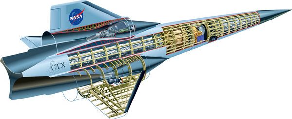 Wikipedia, Air-augmented rockets (also known as rocket-ejector, ramrocket, ducted rocket, integral rocket/ramjets, or ejector ramjets) use the supersonic exhaust of some kind of rocket engine to further compress air collected by ram effect during flight to use as additional working mass, leading to greater effective thrust for any given amount of fuel than either the rocket or a ramjet alone. They represent a hybrid class of rocket/ramjet engines, similar to a ramjet, but able to give useful thrust from zero speed, and are also able in some cases to operate outside the atmosphere, with fuel efficiency not worse than both a comparable ramjet or rocket at every point. OperationIn a conventional chemical rocket engine the rocket carries both its fuel and its oxidizer (the reactant chemical which releases the enormous internal energy in the fuel) with itself in flight. The chemical reaction between the fuel and the oxidizer produces reactant products which are nominally gasses at the pressures and temperatures in the rocket's combustion chamber. The reaction is also highly energetic (exothermic) releasing tremendous energy in the form of heat; that is imparted to the reactant products in the combustion chamber giving this mass enormous internal energy which; when expanded through a nozzle is capable to producing very high exhaust velocities. fuel and a fuel, sometimes pre-mixed, as in a solid rocket, which are then burned. The combustion products are exhausted through a nozzle where they expand and cool. The exhaust is directed rearward through the nozzle, thereby producing a thrust forward. In this conventional design, the fuel/oxidizer mixture is both the working mass and energy source that accelerates it. One method of increasing the overall performance of the system is to collect either the fuel or the oxidizer during flight. Fuel is hard to come by in the atmosphere, but oxidizer in the form of gaseous oxygen makes up 20% of the air and there are a number of designs that take advantage of this fact. These sorts of systems have been explored in the LACE concept. Another idea is to collect the working mass instead. With an air-augmented rocket, an otherwise conventional rocket engine is mounted in the center of a long tube, open at the front. As the rocket moves through the atmosphere the air enters the front of the tube, where it is compressed via the ram effect. As it travels down the tube it is further compressed and mixed with the fuel-rich exhaust from the rocket engine, which heats the air much as a combustor would in a ramjet. In this way a fairly small rocket can be used to accelerate a much larger working mass than normally, leading to significantly higher thrust within the atmosphere. EffectivenessThe effectiveness of this simple method can be dramatic. Typical solid rockets have a specific impulse of about 260 seconds (2.5 kN·s/kg), but using the same fuel in an air-augmented design can improve this to over 500 seconds (4.9 kN·s/kg), a figure even the best hydrogen/oxygen engines can't match. This design can even be slightly more efficient than a ramjet as the exhaust from the rocket engine compresses the air more than a ramjet normally would; this raises the combustion efficiency as a longer, more efficient nozzle can be employed. Another advantage is that the rocket works even at zero forward speed, whereas a ramjet requires forward motion to feed air into the engine. DisadvantagesIt might be envisaged that such an increase in performance would be widely deployed, but various issues frequently preclude this. The intakes of high-speed engines are difficult to design, and they can't simply be located anywhere on the airframe whilst getting reasonable performance – in general the entire airframe needs to be built around the intake design. Another problem is that the air eventually runs out, so the amount of additional thrust is limited by how fast the rocket climbs. Finally, the air ducting weighs about 5 to 10x more than an equivalent rocket that gives the same thrust. This slows the vehicle quite a bit towards the end of the burn. Thus in practice, use of an air-augmented design will normally reduce the overall performance of a rocket due to the extra weight. HistoryThe first serious attempt to make a production air-augmented rocket was the Soviet Gnom design. This was an ICBM whose performance was so improved that it weighed half that of conventional designs. This led to it being light enough, about 30 tonnes, that it could be mounted on the back of a large tank chassis and made fully transportable. Design and test work continued on the design throughout the early 1960s, but ended in 1965 when the chief designer died. More recently NASA has re-examined similar technology for the GTX program as part of an effort to develop SSTO spacecraft. NASA GTX Reference vehicle Many modern solid fueled 'ramjet' powered missiles may in fact be air augmented rockets, and the distinction between a ramjet and an air augmented missile is rather blurred. Many solid fueled ramjet missiles seem to be solid fueled ramrockets in all but name. See also