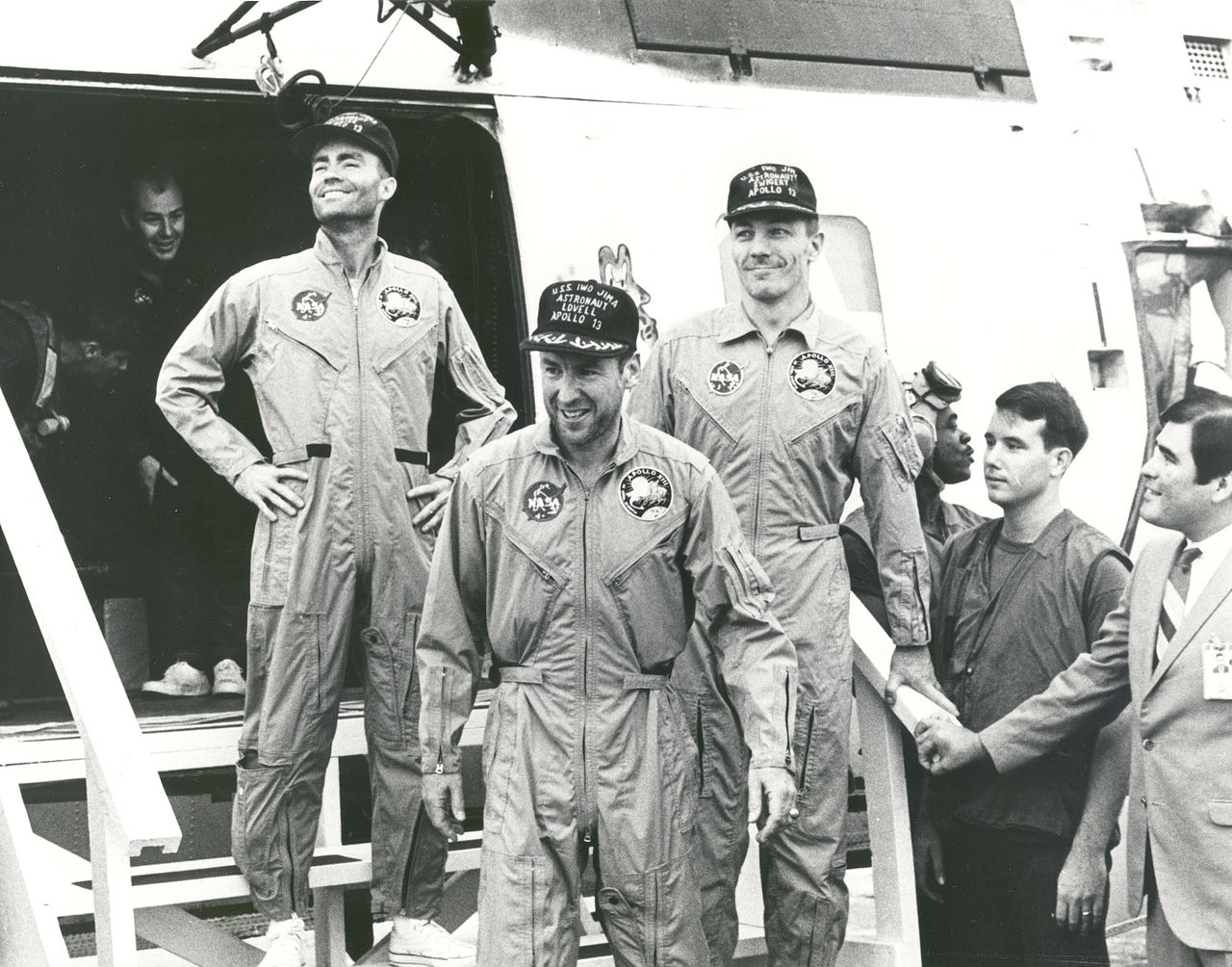 Left to right: Jim Lovell, Jack Swigert, Fred Haise. A routine stir of an oxygen tank ignited damaged wire insulation inside it, causing an explosion that vented the contents of both of the SM's oxygen tanks to space. Without oxygen, needed for breathing and for generating electric power, the SM's propulsion and life support systems could not operate. The CM's systems had to be shut down to conserve its remaining resources for reentry, forcing the crew to transfer to the LM as a lifeboat. With the lunar landing canceled, mission controllers worked to bring the crew home alive. Although the LM was designed to support two men on the lunar surface for two days, Mission Control in Houston improvised new procedures so it could support three men for four days. The crew experienced great hardship, caused by limited power, a chilly and wet cabin and a shortage of potable water. There was a critical need to adapt the CM's cartridges for the carbon dioxide scrubber system to work in the LM; the crew and mission controllers were successful in improvising a solution. The astronauts' peril briefly renewed public interest in the Apollo program; tens of millions watched the splashdown in the South Pacific Ocean on television. An investigative review board found fault with preflight testing of the oxygen tank and Teflon being placed inside it. The board recommended changes, including minimizing the use of potentially combustible items inside the tank; this was done for Apollo 14. The story of Apollo 13 has been dramatized several times, most notably in the 1995 film Apollo 13 – based on Lost Moon, the 1994 memoir co-authored by Lovell – and an episode of the 1998 miniseries From the Earth to the Moon. BackgroundIn 1961, U.S. President John F. Kennedy challenged his nation to land an astronaut on the Moon by the end of the decade, with a safe return to Earth. NASA worked towards this goal incrementally, sending astronauts into space during Project Mercury and Project Gemini, leading up to the Apollo program. The goal was achieved with Apollo 11, which landed on the Moon on July 20, 1969. Neil Armstrong and Buzz Aldrin walked on the lunar surface while Michael Collins orbited the Moon in Command Module Columbia. The mission returned to Earth on July 24, 1969, fulfilling Kennedy's challenge. NASA had contracted for fifteen Saturn V rockets to achieve the goal; at the time no one knew how many missions this would require. Since success was obtained in 1969 with the sixth Saturn V on Apollo 11, nine rockets remained available for a hoped-for total of ten landings. After the excitement of Apollo 11, the general public grew apathetic towards the space program and Congress continued to cut NASA's budget; Apollo 20 was canceled. Despite the successful lunar landing, the missions were considered so risky that astronauts could not afford life insurance to provide for their families if they died in space. Even before the first U.S. astronaut entered space in 1961, planning for a centralized facility to communicate with the spacecraft and monitor its performance had begun, for the most part the brainchild of Christopher C. Kraft Jr., who became NASA's first flight director. During John Glenn's Mercury Friendship 7 flight in February 1962 (the first crewed orbital flight by the U.S.), one of Kraft's decisions was overruled by NASA managers. He was vindicated by post-mission analysis and implemented a rule that, during the mission, the flight director's word was absolute – to overrule him, NASA would have to fire him on the spot. Flight directors during Apollo had a one-sentence job description, "The flight director may take any actions necessary for crew safety and mission success." In 1965, Houston's Mission Control Center opened, in part designed by Kraft and now named for him. In Mission Control, each flight controller, in addition to monitoring telemetry from the spacecraft, was in communication via voice loop to specialists in a Staff Support Room (or "back room"), who focused on specific spacecraft systems. Apollo 13 was to be the second H mission, meant to demonstrate precision lunar landings and explore specific sites on the Moon. With Kennedy's goal accomplished by Apollo 11, and Apollo 12 demonstrating that the astronauts could perform a precision landing, mission planners were able to focus on more than just landing safely and having astronauts minimally trained in geology gather lunar samples to take home to Earth. There was a greater role for science on Apollo 13, especially for geology, something emphasized by the mission's motto, Ex luna, scientia (From the Moon, knowledge). Astronauts and key Mission Control personnel