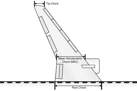 Wikipedia, In aeronautics, chord refers to the imaginary straight line joining the trailing edge and the center of curvature of the leading edge of the cross-section of an airfoil. The chord length is the distance between the trailing edge and the point on the leading edge where the chord intersects the leading edge. The wing, horizontal stabilizer, vertical stabilizer and propeller of an aircraft are all based on airfoil sections, and the term chord or chord length is also used to describe their width. The chord of a wing, stabilizer and propeller is determined by examining the planform and measuring the distance between leading and trailing edges in the direction of the airflow. (If a wing has a rectangular planform, rather than tapered or swept, then the chord is simply the width of the wing measured in the direction of airflow.) The term chord is also applied to the width of wing flaps, ailerons and rudder on an aircraft. Most wings do not have a rectangular planform so they have a different chord at different positions along their span. To give a characteristic figure which can be compared among various wing shapes, the mean aerodynamic chord, or MAC, is used. The MAC is somewhat more complex to calculate, because most wings vary in chord over the span, growing narrower towards the outer tips. This means that more lift is generated on the wider inner portions, and the MAC moves the point to measure the chord to take this into account. Standard mean chordStandard mean chord (SMC) is defined as wing area divided by wing span: