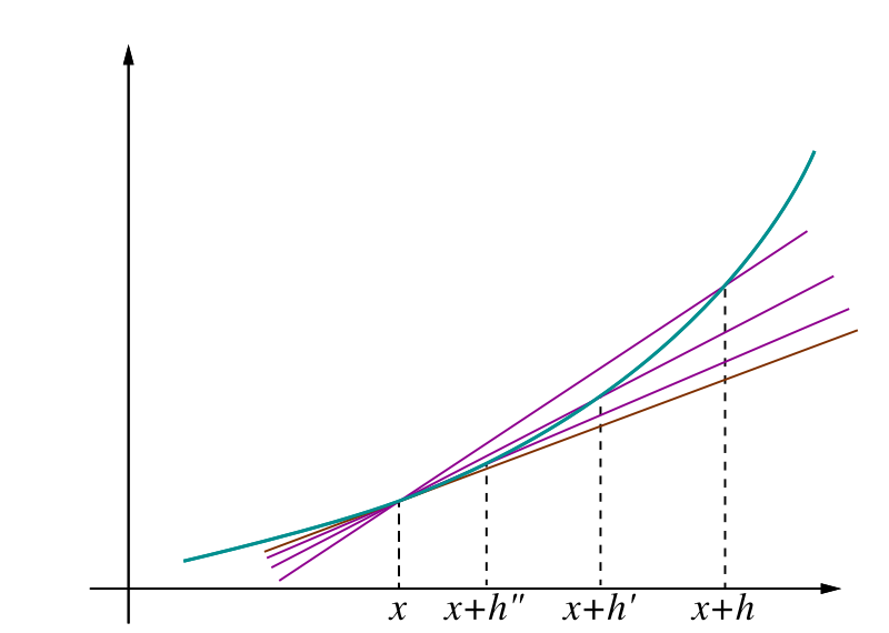 The idea, illustrated by Figures 1-3, is to compute the rate of change as the limiting value of the ratio of the differences Δy / Δx as Δx becomes infinitely small. In Leibniz's notation, such an infinitesimal change in x is denoted by dx, and the derivative of y with respect to x is written suggesting the ratio of two infinitesimal quantities. (The above expression is read as "the derivative of y with respect to x", "d y by d x", or "d y over d x". The oral form "d y d x" is often used conversationally, although it may lead to confusion.) The most common approach to turn this intuitive idea into a precise definition uses limits, but there are other methods, such as non-standard analysis. Definition via difference quotientsLet ƒ be a real valued function. In classical geometry, the tangent line at a real number a was the unique line through the point (a, ƒ(a)) which did not meet the graph of ƒ transversally, meaning that the line did not pass straight through the graph. The derivative of y with respect to x at a is, geometrically, the slope of the tangent line to the graph of ƒ at a. The slope of the tangent line is very close to the slope of the line through (a, ƒ(a)) and a nearby point on the graph, for example (a + h, ƒ(a + h)). These lines are called secant lines. A value of h close to zero will give a good approximation to the slope of the tangent line, and smaller values (in absolute value) of h will, in general, give better approximations. The slope m of the secant line is the difference between the y values of these points divided by the difference between the x values, that is, This expression is Newton's difference quotient. The derivative is the value of the difference quotient as the secant lines approach the tangent line. Formally, the derivative of the function ƒ at a is the limit of the difference quotient as h approaches zero, if this limit exists. If the limit exists, then ƒ is differentiable at a. Here f′ (a) is one of several common notations for the derivative (see below). Equivalently, the derivative satisfies the property that which has the intuitive interpretation (see Figure 1) that the tangent line to ƒ at a gives the best linear approximation to ƒ near a (i.e., for small h). This interpretation is the easiest to generalize to other settings (see below). Substituting 0 for h in the difference quotient causes division by zero, so the slope of the tangent line cannot be found directly. Instead, define Q(h) to be the difference quotient as a function of h: