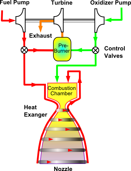 The gas generator cycle is a power cycle of a bipropellant rocket engine. Some of the propellant is burned in a gas-generator and the resulting hot gas is used to power the engine's pumps. The gas is then exhausted. For this reason it is an open cycle (because something is "thrown away") and is also known as open cycle. There are several advantages to the gas generator cycle over its counterpart the staged combustion cycle. The gas generator turbine does not need to deal with the counter pressure of injecting the exhaust into the combustion chamber, this allows the turbine to produce more power and increase the pressure of the fuel and combustion chamber, thus increasing specific impulse or efficiency; also this reduces wear on the turbine, increasing its reliability, reducing its production cost and increasing its operational life-span (particularly advantageous for reusable rockets). The main disadvantage is lost efficiency due to discarded propellant, though this efficiency loss can be outweighed in production engines by the higher chamber pressure's increase in net efficiency. Even so a gas generator cycle tends to have lower specific impulse than a Staged combustion cycle. As in most cryogenic rocket engines, some of the fuel in a gas-generator cycle is used to cool the nozzle and combustion chamber. Current construction materials cannot stand extreme temperatures of rocket combustion processes by themselves. Cooling permits the use of rocket engines for relatively longer periods of time with today’s material technology. Without rocket combustion chamber and nozzle cooling, the engine would fail catastrophically. The Merlin rocket engine is a recent example of a gas-generator engine. The Vulcain engine of Snecma Moteurs is also an example of a gas-generator engine. It is used on the ESA Ariane 5 rocket. See alsoExternal links