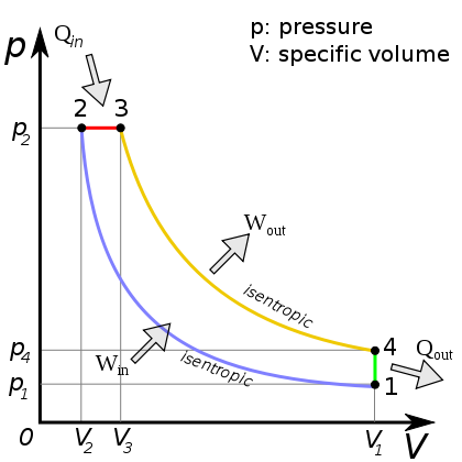 There are a number of variations of these cycles, most notably the Atkinson and Miller cycles. The diesel cycle is somewhat different. Diesel cycleMost truck and automotive diesel engines use a cycle reminiscent of a four-stroke cycle, but with a compression heating ignition system, rather than needing a separate ignition system. This variation is called the diesel cycle. In the diesel cycle, diesel fuel is injected directly into the cylinder so that combustion occurs at constant pressure, as the piston moves, rather than with the four stroke with the piston essentially stationary. Six-strokeThe six stroke engine captures the wasted heat from the four-stroke Otto cycle and creates steam, which simultaneously cools the engine while providing a free power stroke. This removes the need for a cooling system making the engine lighter while giving 40% increased efficiency over the Otto Cycle. Brayton cycleA gas turbine is a rotary machine somewhat similar in principle to a steam turbine and it consists of three main components: a compressor, a combustion chamber, and a turbine. The air after being compressed in the compressor is heated by burning fuel in it, this heats and expands the air, and this extra energy is tapped by the turbine which in turn powers the compressor closing the cycle and powering the shaft. Gas turbine cycle engines employ a continuous combustion system where compression, combustion, and expansion occur simultaneously at different places in the engine—giving continuous power. Notably the combustion takes place at constant pressure, rather than with the Otto cycle, constant volume. Disused methodsIn some old noncompressing internal combustion engines: in the first part of the piston downstroke, a fuel-air mixture was sucked or blown in, and in the rest of the piston downstroke, the inlet valve closed and the fuel-air mixture fired. In the piston upstroke, the exhaust valve was open. This was an attempt at imitating the way a piston steam engine works, and since the explosive mixture was not compressed, the heat and pressure generated by combustion was much less causing lower overall efficiency. Fuels and oxidizersEngines are often classified by the fuel (or propellant) used. FuelsNowadays, fuels used include: