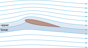 Many alternative explanations for the generation of lift by an airfoil have been put forward, of which a few are presented here. Most of them are intended to explain the phenomenon of lift to a general audience. Although the explanations may share features in common with the explanation above, additional assumptions and simplifications may be introduced. This reduces the validity of an alternative explanation to a limited sub-class of lift generating conditions, or does not allow a quantitative analysis. Several theories introduce assumptions which proved to be wrong, like the equal transit-time theory. Equal transit-timeAn explanation of lift frequently encountered in basic or popular sources is the equal transit-time theory. Equal transit-time states that because of the longer path of the upper surface of an airfoil, the air going over the top must go faster in order to catch up with the air flowing around the bottom. Such that the parcels of air that are divided at the leading edge, and travel above and below an airfoil must rejoin when they reach the trailing edge. However, this is not accurate and the fact that this is not generally the case can be readily observed. Although it is true that the air moving over the top of a wing generating lift does move faster, there is no requirement for equal transit time. In fact the air moving over the top of an airfoil generating lift is always moving much faster than the equal transit theory would imply. Coandă effectIn a limited sense, the Coandă effect refers to the tendency of a fluid jet to stay attached to an adjacent surface that curves away from the flow, and the resultant entrainment of ambient air into the flow. The effect is named for Henri Coandă, the Romanian aerodynamicist who exploited it in many of his patents. One of the first known uses was in his patent for a high-lift device that used a fan of gas exiting at high speed from an internal compressor. This circular spray was directed radially over the top of a curved surface shaped like a lens to decrease the pressure on that surface. The total lift for the device was caused by the difference between this pressure and that on the bottom of the craft. Two aircraft, the Antonov An-72 and An-74 "Coaler", use the exhaust from top-mounted jet engines flowing over the wing to enhance lift, as do the Boeing YC-14 and the McDonnell Douglas YC-15.The effect is also used in high-lift devices such as a blown flap. More broadly, some consider the effect to include the tendency of any fluid boundary layer to adhere to a curved surface, not just the boundary layer accompanying a fluid jet. It is in this broader sense that the Coandă effect is used by some to explain lift. Jef Raskin, for example, describes a simple demonstration, using a straw to blow over the upper surface of a wing. The wing deflects upwards, thus supposedly demonstrating that the Coandă effect creates lift. This demonstration correctly demonstrates the Coandă effect as a fluid jet (the exhaust from a straw) adhering to a curved surface (the wing). However, the upper surface in this flow is a complicated, vortex-laden mixing layer, while on the lower surface the flow is quiescent. The physics of this demonstration are very different from that of the general flow over the wing. The usage in this sense is encountered in some popular references on aerodynamics. In the aerodynamics field, the Coandă effect is commonly defined in the more limited sense above and viscosity is used to explain why the boundary layer attaches to the surface of a wing. In terms of a difference in areasWhen a fluid flows relative to a solid body, the body obstructs the flow, causing some of the fluid to change its speed and direction in order to flow around the body. The obstructive nature of the solid body causes the streamlines to move closer together in some places, and further apart in others. When fluid flows past a 2-D cambered airfoil at zero angle of attack, the upper surface has a greater area (that is, the interior area of the airfoil above the chordline) than the lower surface and hence presents a greater obstruction to the fluid than the lower surface. This asymmetry causes the streamlines in the fluid flowing over the upper surface to move closer together than the streamlines over the lower surface. As a consequence of mass conservation, the reduced area between the streamlines over the upper surface results in a higher velocity than that over the lower surface. The upper streamtube is squashed the most in the nose region ahead of the maximum thickness of the airfoil, causing the maximum velocity to occur ahead of the maximum thickness. In accordance with Bernoulli's principle, where the fluid is moving faster the pressure is lower, and where the fluid is moving slower the pressure is greater. The fluid is moving faster over the upper surface, particularly near the leading edge, than over the lower surface so the pressure on the upper surface is lower than the pressure on the lower surface. The difference in pressure between the upper and lower surfaces results in lift. Newton's laws: Lift and the deflection of the flowThe direct relationship between the lift force and the downward deflection of the air by the wing helps to obtain an insight into the phenomenon of lift. This explanation relies on the second and third of Newton's laws of motion: The net force on an object is equal to its rate of momentum change and To every action there is an equal and opposite reaction.For a fluid, the momentum density is equal to mass density multiplied by the flow velocity. Now consider an airfoil in straight flight at constant speed, and observe the airflow from the frame of reference in which the velocity of the airfoil is zero. John D. Anderson explains the relationship between lift and downwash as follows: "The wing deflects the airflow such that the mean velocity vector behind the wing is canted slightly downward (…). Hence, the wing impar