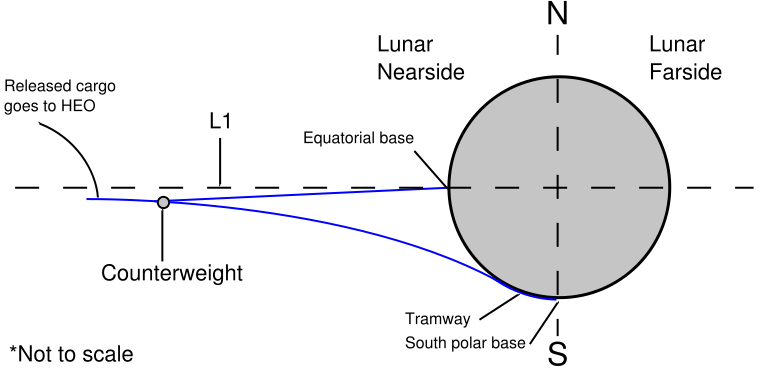 Wikipedia, A lunar space elevator (also called a moonstalk) is a proposed cable running from the surface of the Moon into space. It is similar in concept to the better known Earth space elevator idea (a cable suspended above Earth, with its center of gravity slightly above geostationary orbit). It would instead be constructed with its center of gravity in a stationary position above the surface of the Moon, providing a controlled means to transport people and/or materials between the surface and lunar orbit. A lunar elevator could massively reduce the costs for reliably and cheaply soft-landing equipment on the lunar surface. For example, it permits the use of mass-efficient high impulse/low thrust drives such as Ion drives which otherwise cannot land on the Moon. Since the cable would possess a microgravity point, these and other drives can reach the cable from low Earth orbit (LEO) with very minimal launched fuel from Earth. With conventional rockets, the fuel needed to reach the lunar surface from LEO is many times the landed mass, thus the elevator can slash launch costs for payloads bound for the lunar surface by a similar factor. LocationThere are two lunar-synchronous points where the elevator could be placed that would be stable: the libration points L1 and L2. L1 on the Earth side of the Moon is 56,000 km up from the surface, and L2 on the far side is 67,000 km up. In these positions, the forces of gravity and centrifugal force are equal, and as long as the system remained balanced (L1 and L2 are in unstable equilibrium along the line between Earth and Moon), it would remain stationary. Both of these positions are substantially farther up than the 36,000 km from Earth to geostationary orbit. Furthermore, the weight of the limb of the cable system extending down to the Moon would have to be balanced by the cable extending further up, and the Moon's slow rotation means the upper limb would have to be much longer than for an Earth-based system. To suspend a kilogram of cable or payload just above the surface of the Moon would require 1000 kg of counterweight, 26,000 km beyond L1. (A smaller counterweight on a longer cable, e.g. 100 kg at a distance of 230,000 km — more than halfway to Earth — would have the same balancing effect.) Without the Earth's gravity to attract it, an L2 cable's lowest weight would require 1000 kg of counterweight at a distance of 120,000 km from the Moon. The anchor point of a space elevator is normally at the equator. However, there are several possible cases to be made for locating a lunar base at one of the Moon's poles; a base on a peak of eternal light could take advantage of continuous solar power, for example, or small quantities of water and other volatiles may be trapped in permanently shaded crater bottoms. A space elevator could be anchored near a lunar pole, though not directly at it. A tramway could be used to bring the cable the rest of the way to the pole, with the Moon's low gravity allowing much taller support towers and wider spans between them than would be possible on Earth. FabricationBecause of the Moon's lower gravity and lack of atmosphere, a lunar elevator would have less stringent requirements for the tensile strength of the material making up its cable than an Earth-tethered cable. An Earth-based elevator would require materials at the edge of what is even theoretically possible (e.g. carbon nanotubes), whereas a lunar elevator could be constructed using high-strength commercially available materials such as Kevlar or Spectra. Compared to Earth, there would be few geographic and no political restrictions on the location of the surface connection. Due to the lower gravity, the connection point of a lunar elevator would not necessarily have to be directly under its center of gravity, and could even be near the poles, where evidence suggests there might be frozen water in deep craters that never see sunlight; if so, this might be collected and converted into rocket fuel. Jerome Pearson has proposed a cable design using M5 fiber that would weigh only 6100 tonnes including a massive counterweight, that would be capable of lifting or depositing loads of 2000 N (about 1200 kg mass) at the base. The counterweight could potentially be lifted from the lunar surface. HistoryThe idea of building a space elevator has been around for about 50 years. It was Yuri Artsutanov who in 1960 wrote a Sunday supplement to Pravda on how to build a structure for the space elevator and the utility of geosynchronous orbit. His article however, was not known in the West. Then in 1966, John Isaacs, a leader of a group of American Oceanographers at Scripps Institute, published an article in Science about the concept of using thin wires hanging from a geostationary satellite. As the wires were to be thin, micrometeoroids would have had no trouble cutting them, which makes it impractical. Like Artsutanov, Isaacs’ article also wasn’t known to the aerospace community. It wasn’t until 1975, when Jerome Pearson independently came up with the concept and published it in Acta Astronautica, which finally made the aerospace community at large aware of the space elevator for the first time. His article inspired Sir Arthur Clarke to write his famous novel The Fountains of Paradise. It wasn’t until later that Pearson extended his theory to the moon and changed to using the Lagrangian points instead of having it in geostationary orbit. MaterialsUnlike the earth space elevator, the materials for the lunar space elevators won’t require a lot of strength. The elevator can be made with materials available today. Carbon nanotubes aren’t required to build the structure. This would make it possible to build the elevator much sooner, since available carbon nanotube materials in sufficient quantities are still years away. One material that has great potential is M5 fiber. This is a synthetic fiber that is lighter than Kevlar or Spectra. According to Pearson, Levin, O