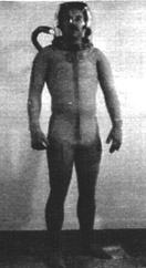 A space activity suit is a kind of spacesuit which provides mechanical pressure by means of elastic garments, as opposed to pressurizing the suit with the breathing gas as is standard practice in conventional spacesuits. The basic design concept is also referred to as a mechanical counterpressure suit and a variety of other names. HistoryEarly in the investigation of space suit design it was concluded that human skin was an almost perfect pressure suit. It had a high tensile strength, almost no gas permeability, and very good water retention characteristics, while automatically controlling heat retention though perspiration. Contrary to urban legend, human skin does not have to "breathe" and is almost completely airtight. The only needed quality that skin did not provide on its own was pressure retention, as its natural flexibility allows internal fluids to collect in areas of low pressure. If mechanical pressure could be allowed to counteract this effect, most of the body could be left unpressurized, only the head would have to be provided with gas pressure, both for breathing as well as protecting the ears and eyes. Additionally, such a suit would almost certainly be lighter than a pressurized suit, and much safer; punctures would not impair the operation of the suit as a whole, and no cooling system was needed as long as the material did not significantly block perspiration. Original research was done by Paul Webb, who published a paper titled "The Space Activity Suit: An Elastic Leotard for Extravehicular Activity" in the April 1968 issue of Aerospace Medicine. The research was funded by NASA, and as the report appeared to be extremely positive, further work was contracted in order to test various design concepts. Between 1968 and 1971 ten designs of increasing sophistication were built, leading eventually to a series of successful tests in vacuum chambers. The longest test was two hours and forty-five minutes. In general terms the tests were successful, and the basic idea that mechanical counter-pressure could create a usable spacesuit was demonstrated conclusively. The energy needed to move about was considerably reduced compared to conventional designs, a major improvement for long-duration spacewalks. Tests of punctures showed that up to a square millimeter of skin could be directly exposed to vacuum for extended periods with no permanent effect, unlike conventional suits which would lose pressure and breathing air along with it. On top of all this, it weighed half as much as the most modern suits then available, those used on Project Apollo. Unfortunately, a number of problems also turned up, primarily related to the problem of keeping the suit in strong mechanical contact at every point on the body. Concavities or small folds in the fabric could lead to fluid pooling in the gaps, and the crotch area proved extremely difficult to tailor successfully. To fill out these areas, small pads of polyurethane foam were inserted into concavities and were successful in most problem areas. The suits also had to be tailored to each individual, although the same was true of the earlier Apollo suits. The largest difficulty was donning and removing the suit. In order to effectively provide the minimum pressure of 29.6 kilopascals (220 mmHg; 4.3 psi) necessary for human physiology, the suit must be extremely tight-fitting, making donning and doffing a highly strenuous task. In 1971, Webb, along with James F. Annis, published their findings in NASA CR-1892, "Development of a Space Activity Suit". The report remained positive, and the researchers felt that further improvements were possible. Quoting the Report: NASA discontinued research into the space activity suit, and pressurized suits are still used as of 2009. However, research is under way at the Massachusetts Institute of Technology (MIT) on a "Bio-Suit" System in preparation for President Bush's Vision for Space Exploration. TechnologySASThe original SAS design was based on two new fabrics, a type of "powernet" (or "girdle fabric") for high-tension areas, and an elastic bobbinet weave for lower-tension areas. Both were based on a heavy elastic warp thread wound around with a much less elastic weft thread forming a netting — the terms warp and weft are used loosely here, the material was not woven using traditional means. Powernet used spandex cord as the warp with nylon cord as the weft, allowing movement primarily along the warp axis. Bobbinet used cotton-wrapped rubber warp and nylon or dacron weft, and was flexible in both directions. The cotton wrapping limited the maximum stretch to 200% of the rest length. The amount of over-pressure bobbinet could create was about 2.0 kilopascals (15 mmHg; 0.29 psi) over the torso, the largest volume, and up to 5.3 kilopascals (40 mmHg; 0.77 psi) over smaller radius curves on the wrist and ankles. Powernet could produce about 6.7 kilopascals (50 mmHg; 0.97 psi) even on the torso. Various layers and patches of the two materials were used in multiple layers to control the overall mechanical pressure around the body. A minimum of 17.3 kilopascals (130 mmHg; 2.5 psi) is needed for normal breathing. The suit as a whole consisted of several layers of the fabrics along with additional layers for other purposes. Starting at the skin, a "slip layer" of light powernet was used to allow the outer layers to slide over the skin without binding. Under this layer a number of foam pads were placed on various concavities on the body to keep them in contact with the suit. On top of this was the counter-pressure bladder, part of the breathing system. On top of this were up to six additional layers of powernet over the trunk with bobbinet arms and legs, or all-bobbinet garments covering the trunk only. The garments were put on like a normal bodysuit with a large zipper closing the front, with additional drawstrings at some points to help close the garment. Zippers on alternating layers were offset. The positive-pres