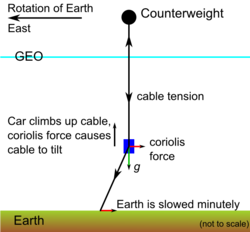 The horizontal speed of each part of the cable increases with altitude, proportional to distance from the center of the Earth, reaching orbital velocity at geostationary orbit. Therefore as a payload is lifted up a space elevator, it needs to gain not only altitude but angular momentum (horizontal speed) as well. This angular momentum is taken from the Earth's own rotation. As the climber ascends it is initially moving slightly more slowly than the cable that it moves onto (Coriolis force) and thus the climber "drags" on the cable. The overall effect of the centrifugal force acting on the cable causes it to constantly try to return to the energetically favourable vertical orientation, so after an object has been lifted on the cable the counterweight will swing back towards the vertical like an inverted pendulum. Provided that the space elevator is designed so that the center of weight always stays above geostationary orbit for the maximum climb speed of the climbers, the elevator cannot fall over. Lift and descent operations must be carefully planned so as to keep the pendulum-like motion of the counterweight around the tether point under control. By the time the payload has reached GEO the angular momentum (horizontal speed) is enough that the payload is in orbit. The opposite process would occur for payloads descending the elevator, tilting the cable eastwards and insignificantly increasing Earth's rotation speed. It has also been proposed to use a second cable attached to a platform to lift payload up the main cable, since the lifting device would not have to deal with its own weight against Earth's gravity. Out of the many proposed theroies, powering any lifting device also continues to present a challenge. Powering climbersBoth power and energy are significant issues for climbers - the climbers need to gain a large amount of potential energy as quickly as possible to clear the cable for the next payload. Nuclear energy and solar power have been proposed, but generating enough energy to reach the top of the elevator in any reasonable time without weighing too much is not feasible. The proposed method is laser power beaming, using megawatt powered free electron or solid state lasers in combination with adaptive mirrors approximately 10 m wide and a photovoltaic array on the climber tuned to the laser frequency for efficiency. A major obstacle for any climber design is the dissipation of the substantial amount of waste heat generated due to the less than perfect efficiency of any of the power methods. Yoshio Aoki, a professor of precision machinery engineering at Nihon University and director of the Japan Space Elevator Association, suggested including a second cable and using the conductivity of carbon nanotubes to provide power. CounterweightThere have been several methods proposed for dealing with the counterweight need: a heavy object, such as a captured asteroid or a space station, positioned past geostationary orbit, or extending the cable itself well past geostationary orbit. The latter idea has gained more support in recent years due to the relative simplicity of the task and the fact that a payload that went to the end of the counterweight-cable would acquire considerable velocity relative to the Earth, allowing it to be launched into interplanetary space. Additionally, Brad Edwards has proposed that initially elevators would be up-only, and that the elevator cars that are used to thicken the cable could simply be parked at the top of the cable and act as a counterweight. Launching into outer spaceThe velocities that might be attained at the end of Pearson's 144,000 km cable can be determined. The tangential velocity is 10.93 kilometers per second which is more than enough to escape Earth's gravitational field and send probes at least as far out as Jupiter. Once at Jupiter a gravitational assist manoeuvre permits solar escape velocity to be reached. Extraterrestrial elevatorsA space elevator could also be constructed on other planets, asteroids and moons. A Martian tether could be much shorter than one on Earth. Mars' surface gravity is 38% of Earth's, while it rotates around its axis in about the same time as Earth. Because of this, Martian areostationary orbit is much closer to the surface, and hence the elevator would be much shorter. Exotic materials might not be required to construct such an elevator. However, building a Martian elevator would be a unique challenge because the Martian moon Phobos is in a low orbit, and intersects the Equator regularly (twice every orbital period of 11 h 6 min). A lunar space elevator can possibly be built with currently available technology about 50,000 kilometers long extending though the Earth-Moon L1 point from an anchor point near the center of the visible part of Earth's moon. On the far side of the moon, a lunar space elevator would need to be very long (more than twice the length of an Earth elevator) but due to the low gravity of the Moon, can be made of existing engineering materials. Rapidly spinning asteroids or moons could use cables to eject materials in order to move the materials to convenient points, such as Earth orbits; or conversely, to eject materials in order to send the bulk of the mass of the asteroid or moon to Earth orbit or a Lagrangian point. This was suggested by Russell Johnston in the 1980s. Freeman Dyson, a physicist and mathematician, has suggested using such smaller systems as power generators at points distant from the Sun where solar power is uneconomical. For the purpose of mass ejection, it is not necessary to rely on the asteroid or moon to be rapidly spinning. Instead of attaching the tether to the equator of a rotating body, it can be attached to a rotating hub on the surface. This was suggested in 1980 as a "Rotary Rocket" by Pearson and described very succinctly on the Island One website as a "Tapered Sling" ConstructionThe construction of a space elevator would be a vast project requiring advance