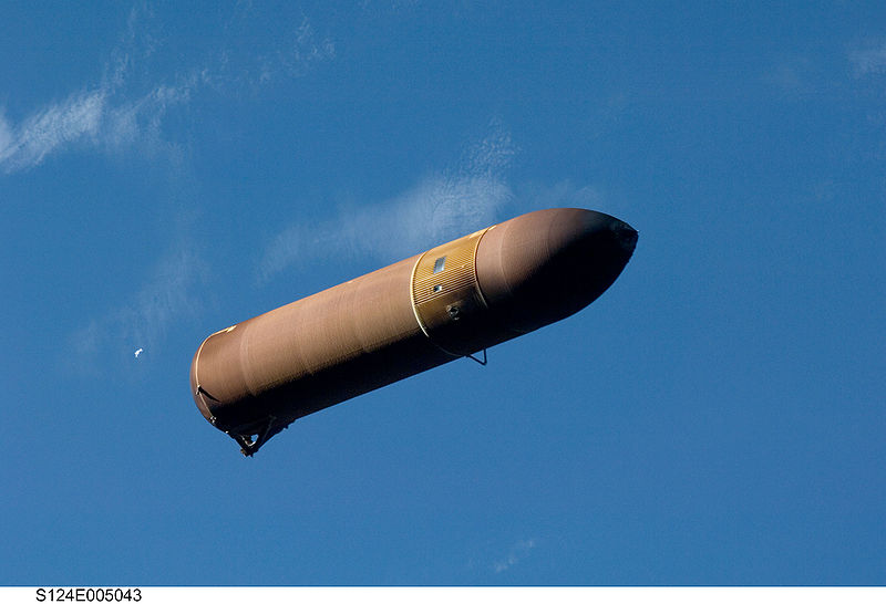 A Space Shuttle External Tank (ET) is the component of the Space Shuttle launch vehicle that contains the liquid hydrogen fuel and liquid oxygen oxidizer. During lift-off and ascent it supplies the fuel and oxidizer under pressure to the three space shuttle main engines (SSME) in the orbiter. The ET is jettisoned just over 10 seconds after MECO (Main Engine Cut Off), where the SSMEs are shut down, and re-enters the Earth's atmosphere. Unlike the Solid Rocket Boosters, external tanks are not reusable. They break up before impact in the Indian Ocean (or Pacific Ocean in the case of direct-insertion launch trajectories, which are currently utilized) away from known shipping lanes. Overview