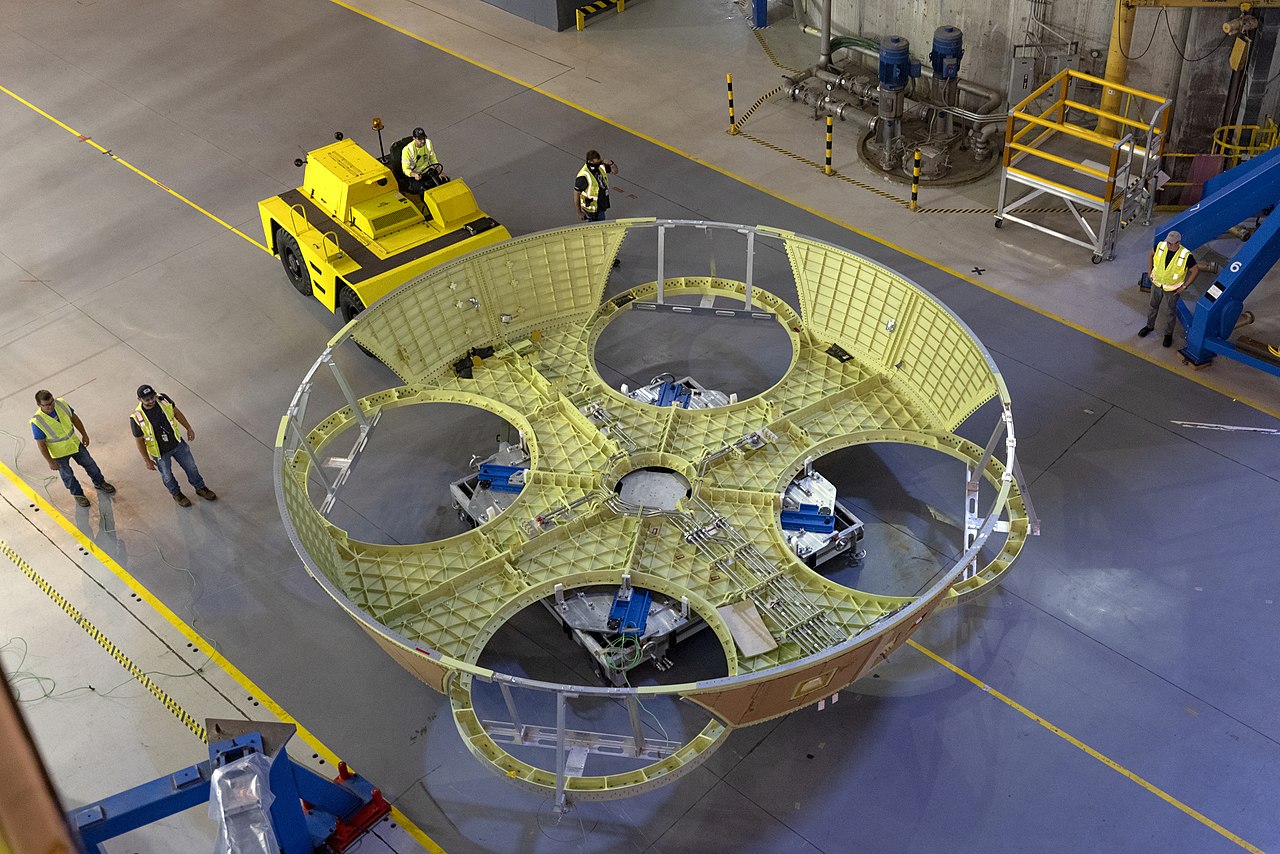 The SLS core stage rolling out of the Michoud Assembly Facility for shipping to Stennis Space Center. After the first four Artemis missions, NASA plans to transfer production and launching of the Space Launch System to Deep Space Transport LLC, a joint venture between Boeing and Northrop Grumman. DescriptionThe SLS is a Space Shuttle-derived launch vehicle. The first stage of the rocket is powered by one central core stage and two outboard solid rocket boosters. All SLS Blocks share a common core stage design, while they differ in their upper stages and boosters. Core stageTogether with the solid rocket boosters, the core stage is responsible for propelling the upper stage and payload out of the atmosphere and accelerating up to almost orbital velocity. It contains the liquid hydrogen fuel and liquid oxygen oxidizer tanks for the ascent phase, the forward and aft solid rocket booster attach points, avionics, and the Main Propulsion System (MPS). The MPS is responsible for supplying the four RS-25 engines with fuel and oxidizer, gimballing the engines using hydraulic actuators, and pressurizing the propellant tanks via autogenous pressurization. The core stage provides approximately 25% of the vehicle's thrust at liftoff. The stage is 213 ft (65 m) long by 28 ft (8.4 m) in diameter and is both structurally and visually similar to the Space Shuttle external tank. The first four flights will each use and expend four of the remaining sixteen RS-25D engines previously flown on Space Shuttle missions. Aerojet Rocketdyne modifies these engines with modernized engine controllers, higher throttle limits, as well as insulation for the high temperatures the engine section will experience due to their position adjacent to the solid rocket boosters. Later flights will switch to a RS-25 variant optimized for expended use, the RS-25E, which will lower per-engine costs by over 30%. The thrust of each RS-25D engine has been increased from 492,000 lbf (2,188 kN), as on the Space Shuttle, to 513,000 lbf (2,281 kN) on the sixteen modernized engines. The RS-25E will further increase per-engine thrust to 522,000 lbf (2,321 kN). BoostersBlocks 1 and 1B of the SLS are planned to use two five-segment solid rocket boosters. These solid rocket boosters use casing segments that were flown on Shuttle missions as parts of the four-segment Space Shuttle Solid Rocket Boosters. They possess an additional center segment, new avionics, and lighter insulation, but lack a parachute recovery system. The propellants for the solid rocket boosters are aluminum powder, which is very reactive, and ammonium perchlorate, a powerful oxidizer. They are held together by a binder, polybutadiene acrylonitrile (PBAN). The mixture has the consistency of a rubber eraser and is packed into each segment. The five-segment solid rocket boosters provide approximately 25% more total impulse than the Shuttle Solid Rocket Boosters, but will not be recovered after use. The stock of SLS Block 1 to 1B boosters is limited by the number of casings left over from the Shuttle program, which allows for eight flights of the SLS. On 2 March 2019, the Booster Obsolescence and Life Extension program was announced. This program will develop new solid rocket boosters, to be built by Northrop Grumman Space Systems, for further SLS flights, marking the beginning of Block 2. These boosters will be derived from the composite-casing solid rocket boosters then in development for the canceled OmegA launch vehicle, and are projected to increase Block 2's payload to 290,000 lb (130 t) to LEO and at least 101,000 lb (46 t) to trans-lunar injection. As of July 2021, the BOLE program is under heavy development, with first firing expected in 2024. Upper stagesThe Interim Cryogenic Propulsion Stage (ICPS) is planned to fly on Artemis 1, 2, and 3 as the upper stage of SLS Block 1. It is a stretched and human-rated Delta IV 16 ft (5 m) Delta Cryogenic Second Stage powered by a single RL10 engine. The first ICPS will use the RL10B-2 variant, while the second and third ICPS will use the RL10C-2 variant. Block 1 is intended to be capable of lifting 209,000 lb (95 t) to low Earth orbit (LEO) in this configuration, including the weight of the ICPS as part of the payload. At the time of SLS core stage separation, Artemis 1 will be travelling on an initial 1,806 by 30 km (1,122 by 19 mi) suborbital trajectory. This trajectory will ensure safe disposal of the core stage. ICPS will then perform orbital insertion and a subsequent translunar injection burn to send Orion towards the Moon. The ICPS will be human-rated for the crewed Artemis 2 and 3 flights. The Exploration Upper Stage (EUS) is planned to fly on Artemis 4. The EUS will complete the SLS ascent phase and then re-ignite to send its payload to destinations beyond LEO. It is expected to be used by Block 1B and Block 2. The EUS shares the core stage diameter of 8.4 meters, and will be powered by four RL10C-3 engines. It will eventually be upgraded to use four improved RL10C-X engines. As of March 2022, Boeing is developing a new composite-based fuel tank for the EUS that would increase Block 1B's overall payload mass capacity to TLI by 30 percent. The improved upper stage was originally named the Dual Use Upper Stage (DUUS, pronounced "duce") but was later renamed the Exploration Upper Stage (EUS). Block variants