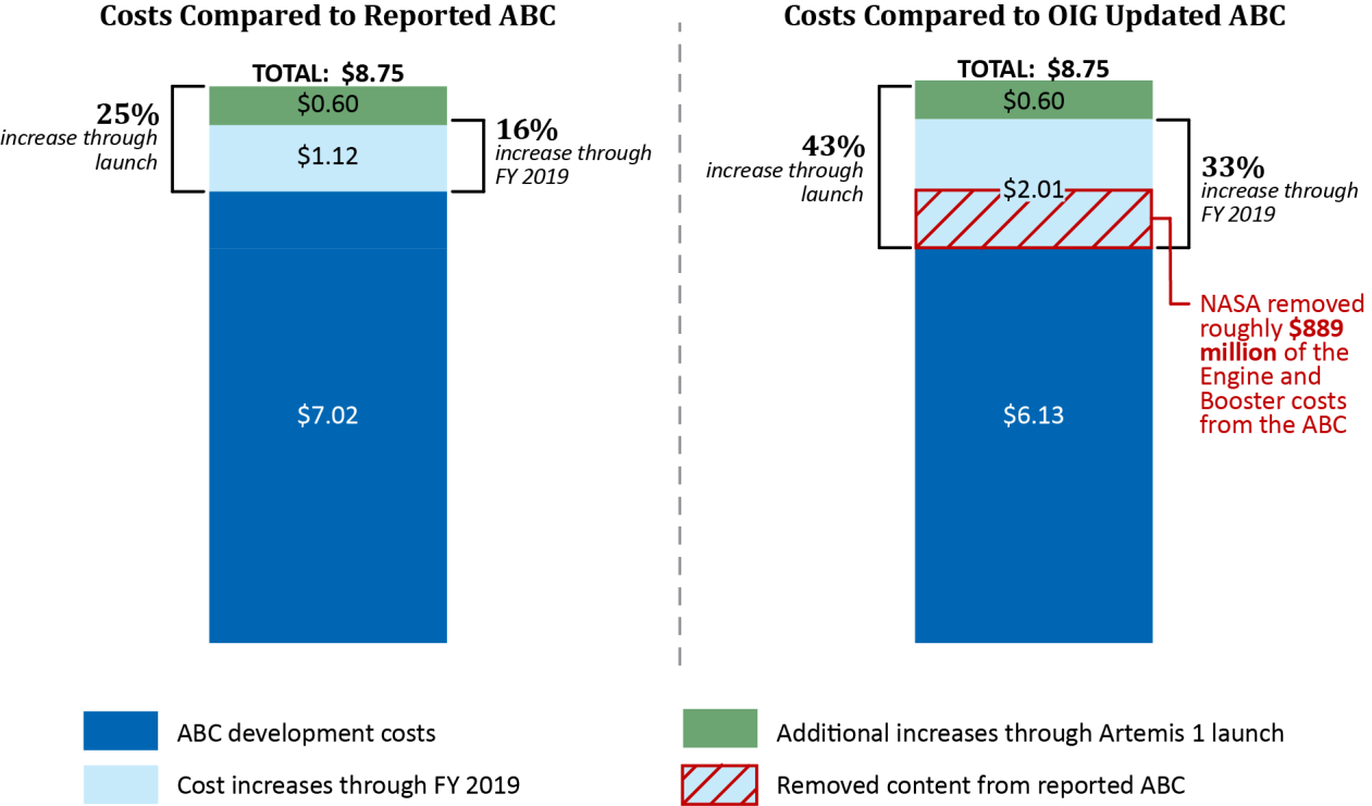 Visual from the March 2020 Inspector General report, showing how NASA used accounting to "mask" a cost increase by moving the boosters (which cost $889 million) from the SLS to another cost center, without updating the SLS budget to match. Lori Garver, a former NASA Deputy Administrator, called for canceling the launch vehicle alongside the Mars 2020 rover. Phil Plait shared his criticism of the SLS in light of ongoing budget tradeoffs between the Commercial Crew Development and SLS budgets, also referring to earlier critiques by Garver. In 2019, the Government Accountability Office found that NASA had awarded Boeing over $200 million for service with ratings of good to excellent despite cost overruns and delays. As of 2019, the maiden launch of the SLS was expected in 2021. NASA continued to expect that the first orbital launch would be in 2021 as late as May 2021. NASA moved out $889 million of costs relating to SLS boosters, but did not update the SLS budget to match, a March 2020 Inspector General report found. This kept the budget overrun to 15% by FY 2019. At 30%, NASA would have to notify Congress and stop funding unless Congress reapproves and provides additional funding. The Inspector General report found that were it not for this "masking" of cost, the overrun would have been 33% by FY 2019. The GAO separately stated "NASA's current approach for reporting cost growth misrepresents the cost performance of the program".
