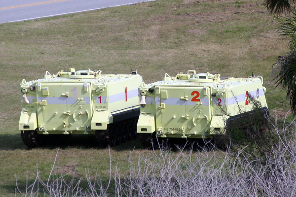 Final launch of a Saturn IB (AS-210) from pad 39B, carrying the Apollo-Soyuz Test Project Command Module into orbit, July 24, 1975. The payload to be installed at the launch pad was independently transported in a payload transportation canister and then installed vertically at the Payload Changeout Room. Otherwise, payloads would have already been pre-installed at the Orbiter Processing Facility and transported within the orbiter's cargo bay. The original structure of the pads was remodeled for the needs of the Space Shuttle, starting with Pad 39A after the last Saturn V launch, and, in 1977, that of Pad 39B after the Apollo-Soyuz in 1975. The first usage of the pad for the Space Shuttle came in 1979, when Enterprise was used to check the facilities prior to the first operational launch. Service structures Each pads contained a two-piece access tower system, the Fixed Service Structure (FSS) and the Rotating Service Structure (RSS). The FSS permitted access to the Shuttle via a retractable arm and a "beanie cap" to capture vented LOX from the external tank. Sound Suppression Water System A Sound Suppression Water System (SSWS) was added to protect the Space Shuttle and its payload from effects of the intense sound wave pressure generated by its engines. An elevated water tank on a 290-foot (88 m) tower near each pad stored 300,000 U.S. gallons (1,100,000 liters) of water, which was released onto the mobile launcher platform just before engine ignition. The water muffled the intense sound waves produced by the engines. Due to heating of the water, a large quantity of steam and water vapor was produced during launch. Swing arm modifications The Gaseous Oxygen Vent Arm positioned a hood, often called the "Beanie Cap", over the top of the external tank (ET) nose cone during fueling. Heated gaseous nitrogen was used there to remove the extremely cold gaseous oxygen that normally vented out of the external tank. This prevented the formation of ice that could fall and damage the shuttle. The Hydrogen Vent Line Access Arm mated the External Tank's Ground Umbilical Carrier Plate (GUCP) to the launch pad hydrogen vent line. The GUCP provided support for plumbing and cables, called umbilicals, that transferred fluids, gases, and electrical signals between two pieces of equipment. While the External Tank was being fueled, hazardous gas was vented from an internal hydrogen tank, through the GUCP, and out a vent line to a flare stack where it was burned off at a safe distance. Sensors at the GUCP measured gas level. The GUCP was redesigned after leaks created scrubs of STS-127 and were also detected during attempts to launch STS-119 and STS-133. The GUCP released from the ET at launch and fell away with a curtain of water sprayed across it for protection from flames. Emergency pad evacuation In an emergency, the launch complex used a slidewire escape basket system for quick evacuation. Assisted by members of the closeout team, the crew would leave the orbiter and ride an emergency basket to the ground at speeds reaching up to 55 miles per hour (89 km/h). From there, the crew took shelter in a bunker. A modified M113 Armored Personnel Carrier could carry injured astronauts away from the complex to safety. During the launch of Discovery on STS-124 on May 31, 2008, the pad at LC-39A suffered extensive damage, in particular to the concrete trench used to deflect the SRB's flames. The subsequent investigation found that the damage was the result of carbonation of epoxy and corrosion of steel anchors that held the refractory bricks in the trench in place. The damage had been exacerbated by the fact that hydrochloric acid is an exhaust by-product of the solid rocket boosters. Space Shuttle launches