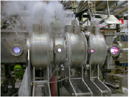 Other applications for VASIMR such as rapid transportation of people to Mars requires a very high power, low mass energy source, such as nuclear. In August 2008, Tim Glover, Ad Astra director of development, has publicly stated that the first expected application of VASIMR engine is "hauling things [non-human cargo] from low-Earth orbit to low-lunar orbit" supporting NASA's return to Moon efforts. Current developmentThe principal developer of the VASIMR has been the Ad Astra Rocket Company. Currently, efforts have been focused on improving the overall efficiency of the engine by scaling up power levels. According to company's data, current VASIMR efficiency is at 67%. Published data on the VX50 engine, capable of processing 50kW of total radio frequency power, shows efficiency to be 59% calculated as: 90% NA ion generation efficiency × 65% NB ion speed boosting efficiency. Model VX100 is expected to have an overall efficiency of 72% by improving the NB ion speed boosting efficiency to 80%. There are, however, additional (smaller) inefficiency losses related to the conversion of DC electric current to radio frequency power and also to the superconducting magnets' energy consumption. By comparison, current state-of-the-art, proven ion engine designs like NASA's HiPEP operate at 80% total thruster/PPU energy efficiency. Published test data on VASIMR engine model VX50 show it to be capable of 0.5 N thrust. The Ad Astra Rocket Company plans to ground test a prototype rocket in early 2008; the VX-200 rated at 200 kW total radio frequency power, to demonstrate the required efficiency, thrust and specific impulse. On October 24, 2008 the company announced that the plasma generation aspect of the VX-200 engine: helicon first stage or solid-state high frequency power transmitter, has reached operational status. The key enabling technology, solid-state DC-RF power-processing, has become very efficient reaching up to 98% efficiency. The helicon discharge uses 30 kWe of radio waves to turn Argon gas into plasma. The remaining 170 kWe of power is allocated for passing energy to, and acceleration of, plasma in the second part of the engine via ion cyclotron resonance heating. Based on data released from previous VX-100 testing, we can expect that the VF-200 engine (to be installed on ISS) will have a system efficiency of 60-65% and thrust level of 5N. Optimal specific impulse appears to be around 5000s using low cost argon propellant. The specific power is estimated at 1.5 kg/kW meaning that this version of the VASIMR engine will weigh only about 300 kg. One of the remaining untested issues is: potential vs actual thrust. That is, whether or not the hot plasma actually gets detached from the rocket. This will be confirmed in 2009 when a VX-200 engine will be installed and tested in a large enough vacuum chamber. Another issue is waste heat management (60% efficiency means about 80kW of unnecessary heat) critical to allowing for continuous operation of VASIMR engine. On December 10, 2008 Ad Astra Company signed an agreement with NASA to arrange the placement and testing of a flight version of the VASIMR, the VF-200, on the International Space Station (ISS). Its launch is expected to be in 2011-2012. The ISS VASIMR engine will operate in burst mode. Since ISS's power generation is not great enough, the system will include a trickle-charged battery system allowing for 10 min pulses of thrust. This however, is expected to be sufficient to maintain ISS altitude, eliminating the need for costly, periodic chemical rocket reboosting operations. As of 31st May 2009, tests have begun on the VX-200 prototype with fully integrated superconducting magnets. They intend to expand the power range of the VASIMR up to its full operational capability. If these tests prove successful, Ad Astra will develop a flight capable VASIMR to be installed on the ISS. Space tug : Orbital Transfer VehicleThe most important near-future application of VASIMR-powered spacecraft is transportation of cargo. Numerous studies have shown that, despite longer transit times, VASIMR-powered spacecraft will be much more efficient than traditional integrated chemical rockets at moving goods through space. An OTV (space tug) powered by a single VF-200 engine would be capable of transporting about 7 metric tons of cargo from Low Earth Orbit (LEO) to Low Lunar Orbit (LLO) with about a six month long transit time. NASA envisages delivering about 34 metric tons of useful cargo to LLO in a single flight with a chemically propelled vehicle. To make that trip, about 60 tonnes of LOX-LH2 propellant would be burned. A comparable OTV would need to employ 5 VF-200 engines powered by a 1 MW solar array. To do the same job, such OTV would need to expend only about 8 metric tonnes of argon propellant. The OTV transit times can be reduced by flighting with lighter loads and/or expanding more argon propellant with VASIMR throttled down to lower Isp. For instance, an empty OTV on the return trip to Earth covers the distance in about 23 days at optimal specific impulse of 5000s or in about 14 days at Isp of 3000s. See also