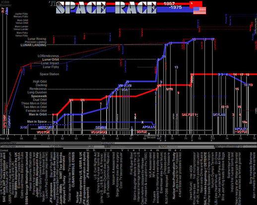 http://en.wikipedia.org/wiki/Timeline_of_the_Space_Race The Space Race was an informal competition between the United States and the Soviet Union that lasted roughly from 1957 to 1975. It involved the parallel efforts by each of those countries to explore outer space with artificial satellites, to send humans into space, and to land people on the Moon. Here is a timeline of key events in the Space Race.
