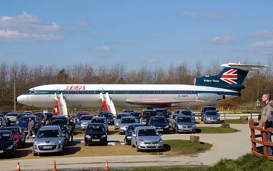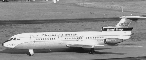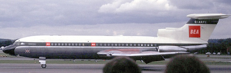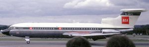 The Trident was the first commercial aircraft to be fitted with a Quick access flight data recorder. It sampled 13 variables, converted them to a digital format, storing them on tape for ground analysis. A notable feature of the Trident was its use in the development of a completely automatic blind landing system, the "Autoflare", developed by Hawker Siddeley and Smiths Aircraft Instruments. The Trident performed the first automatic blind landing by a civil airliner in fog on 4 November 1966, pioneering the ability to land in fog, a major problem at London Heathrow. These delays were relatively common during the period when Category 1 (Cat 1 = 200 ft decision height and 600 metre runway visual range RVR) instrument landing system (ILS) was in use. The Trident, its autoland system and three pilots pioneered the use of lower landing limits starting with Cat 2 (100 ft decision height and 400 metres RVR). Because the Trident fleet could make successful approaches and landings to airfields equipped with suitable Cat 2 ILS installations it frequently operated to its intended destination, while other aircraft were forced to divert. The Trident also had the unusual capability to use reverse thrust in flight. This was limited to the two "pod" engines, and the normal landing procedure was to close the throttles in the flare, and immediately open the reverser buckets by selecting reverse idle. At the pilot's discretion, up to full power could then be selected in reverse prior to touchdown. Useful on wet or slippery runways, it produced a firm but well-controlled touchdown, and reduced hydroplaning, giving a very short landing. This compensated for its rather poor braking characteristics. The use of reverse thrust up to 10,000 rpm was also permitted for emergency descent purposes. At indicated airspeeds below 280 kts it was also permissible to extend the main landing gear (but not the nosewheel) as an emergency airbrake, and when combined with conventional speedbrakes and reverse thrust this produced a phenomenal rate of emergency descent in the region of 12,000 feet per minute.. Another advanced feature for the era was a moving map display on the centre instrument panel. This was an electro-mechanical system with a stylus indicating the aircraft position over a motor-driven paper roll. Position was derived from a doppler navigation system which produced groundspeed and drift data, which combined with heading data could drive motors moving the stylus from side to side for lateral position, and the paper roll for the track. Operational historyHawker Siddeley Aviation, by this time the parent of de Havilland, needed additional customers for the Trident, so entered into discussions with American Airlines (AA) in 1960. They demanded an aircraft with a longer range, which meant that the original DH121 design would have fulfilled American's requirements almost perfectly. To fill AA's needs, design began on a new Trident 1A, powered with uprated Rolls-Royce Spey 510s of 10,700 lbf (47.6 kN) thrust, and a larger wing with more fuel, raising gross weight to 120,000 lb (54 000 kg) and range to 1,800 miles (2900 km). American Airlines eventually declined the aircraft in favour of the Boeing 727, an aircraft which filled the original DH121 specifications almost exactly. In fact, de Havilland had invited a group of engineers from Boeing to see the DH121 design and development program in its early stages, partly because Boeing was looking to develop a similar medium-range version of its 707 design. Some of these changes were nevertheless added into the original prototype, and it was renamed the Trident 1C. The main difference was a larger fuel tank in the centre section of the wing, raising weights to 115,000 lb (52 000 kg) and range to 1,400 miles (2250 km). The first Trident 1, G-ARPA, made its maiden flight on 9 January 1962 from Hatfield Aerodrome, and entered service on 1 April 1964. By 1965 there were 15 Tridents in BEA's fleet and by March 1966 this had risen to 21. Hawker-Siddeley then proposed an improved 1C, the Trident 1E. This would use 11,400 lbf (50.7 kN) Spey 511s, have a gross weight of 128,000 lb (58 000 kg), an increased wing area by extending the chord, and the same fuselage but with up to 140 seats in a six-abreast configuration. This specification took the 1C closer to the larger concept of the original DH121, but powered with 7,000 lbf (31 kN) less thrust. There were only a few sales of the new design: three each for Kuwait Airways and Iraqi Airways, four for PIA (later sold to CAAC), two each for Channel Airways and Northeast Airlines, and one for Air Ceylon. Trident 2At this point BEA decided that the Trident was now too short-legged for its ever-expanding routes, and that an even longer-ranged version was needed. Hawker-Siddeley responded with another upgrade as the Trident 1F. It would have the Spey 511 engines, a 2.8 m fuselage stretch, a gross weight of 132,000 lb (60 000 kg) and up to 128 seats in the original five-abreast configuration. BEA planned to buy 10 1Fs, plus an option for 14 further aircraft. As work continued on the 1F the changes became so widespread that it was renamed the Trident 2E, E for Extended Range. Now powered by newer Spey 512s with 11,930 lbf (53.1 kN) thrust, it also replaced wing leading-edge droops with slats, and extended the span with Kuchemann-style tips. It had a gross weight of 142,400 lb (65 000 kg) and a 2,000 mile (3200 km) range. BEA bought 15, two were bought by Cyprus Airways and 33 by CAAC, the Chinese national airline. The first flight of this version was made on 27 July 1967 and it entered service with BEA in April 1968. Trident 3By this point the Trident was becoming the backbone of the BEA fleet and BEA wanted an even larger aircraft. Hawker-Siddeley offered two new designs in 1965, a larger 158-seat two-engine aircraft otherwise similar to the Trident known as the HS132, and the 185-seat HS134, which moved the engines under the wings and led