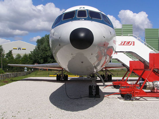 In July 1956 BEA offered a contract for a new medium-haul jet aircraft to replace the turboprop Vickers Viscount on its longer European routes. The new aircraft would work beside a smaller design for shorter ranges, which would eventually emerge as the BAC One-Eleven. Several designs were submitted for the longer-range role, including the Bristol 200, the Avro 740, the Vickers VC11 and de Havilland's DH121. The DH121 was selected as the winner in 1958. The DH121 was the first trijet design, a configuration which its designers felt offered a trade-off between cruising economy and take-off safety in case of an engine failure. The plane included a cruciform tail design similar to the Sud Aviation Caravelle. With the engines clustered at the rear, also like the Caravelle, the wing was left free from engine mounts and was designed with high-speed cruising in mind, a speed of over 600 mph being the goal. The Trident has a distinctive offset, sidewards retracting front landing gear. The DH121 was to be powered by 13,790 lbf (61.34 kN) Rolls-Royce Medway engines, with a gross weight of 150,000 lb (63 000 kg), a range of 2,070 miles (3330 km), and to seat 111 in a two-class layout. At this point BEA decided that the 111-seat aircraft was too large for its routes so it tried to tailor its aircraft to its exact needs. The result was a downsizing of the Trident, powered by much smaller 9,850 lbf (43.8 kN) Rolls-Royce Spey 505 engines, with a gross weight of 105,000 pounds (48 000 kilograms), a range of 930 miles (1500 kilometres), and seating for 97. This version gained the variable-incidence T-tail it would have from then on, as well as a new nose design, both of which made it look very different from the Comet-like original version. BEA was happier with this smaller design (now known as the Trident 1 after BEA had held a competition to name it) and placed a contract for 24 on 12 August 1959. DesignThe Trident is a jet airliner of all-metal construction with a T-tail and low-mounted swept wing. It has three rear-mounted engines: two in side-fuselage pods, with the third in the fuselage, fed intake air through an S-shaped duct. Some versions featured a fourth engine fed from a separate duct on top of the normal one. All versions were powered by versions of the Rolls-Royce Spey, the fourth engine being another Rolls-Royce design, the small RB162. The Trident was one of the fastest subsonic commercial airliners, regularly cruising at over 600 mph (965 km/h). On initial introduction the standard cruise Mach Number was 0.88/ 380kts IAS, probably the highest of any of its contemporaries. The wing, designed for high speed, gave limited lift at lower speeds. This, and its low power, required long takeoff rolls. The aircraft gained the nickname "ground gripper" for the way it stuck to the runway; and it was also joked that Tridents only became airborne because of the curvature of the Earth.