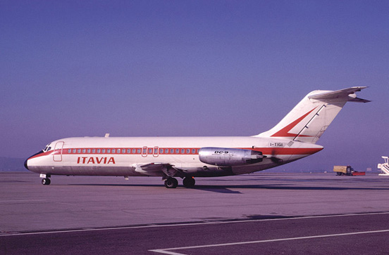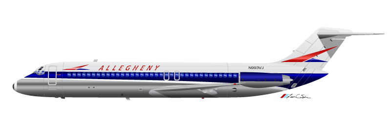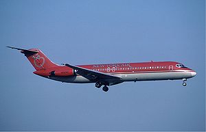 The McDonnell Douglas DC-9 (initially known as the Douglas DC-9) is a twin-engine, single-aisle jet airliner. It was first manufactured in 1965 with its maiden flight later that year. The DC-9 was designed for frequent, short flights. The final DC-9 was delivered in October 1982. The DC-9 was followed in subsequent modified forms by the MD-80, MD-90 and Boeing 717. With the final two deliveries of the 717 in 2006, production of the DC-9 aircraft family ceased after 41 years and nearly 2,500 units built. Design and developmentDuring the 1950s, Douglas Aircraft began studying a short-medium range airliner to complement its higher capacity, long range DC-8. A medium range, four-engine design was studied, but it did not receive enough interest from airlines and was abandoned. Then in 1960, Douglas signed a two-year contract with Sud Aviation for technical cooperation. As part of the agreement Douglas would help market and support the Sud Aviation Caravelle along with license-production of an American version if orders were high enough. However, no orders were received and Douglas returned to its design studies after the two years. In 1962, early design studies were underway. The first version seated 63 passengers and had a gross weight of 69,000 lb (31,300 kg). This design was changed into what would be initial DC-9 variant. Douglas officially gave approval to produce the DC-9 on April 8, 1963. Unlike the competing but slightly larger Boeing 727 trijet, which used as many 707 components as possible, the DC-9 was an all-new design. The DC-9 features two rear fuselage-mounted Pratt & Whitney JT8D turbofan engines, relatively small, efficient wings, and a T-tail. The DC-9's maximum takeoff weight was limited to 80,000 lb (36,300 kg) for a two-person flight crew by Federal Aviation Agency regulations at the time. DC-9 aircraft have 5 seats across for economy seating. The airplane seats 80 to 135 passengers depending on version and seating arrangement. (Note: DC stands for Douglas Commercial.)